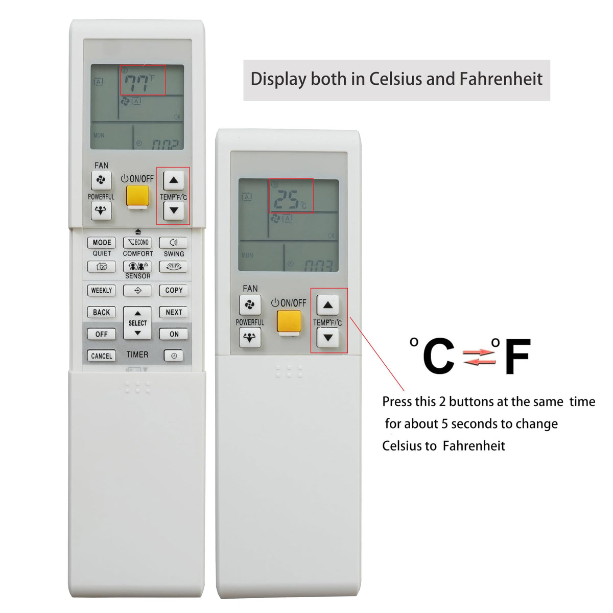 Q: Can I switch between Celsius and Fahrenheit on the remote?A: Yes, this remote control displays temperature settings in both Celsius and Fahrenheit, making it easy to use based on your preference.