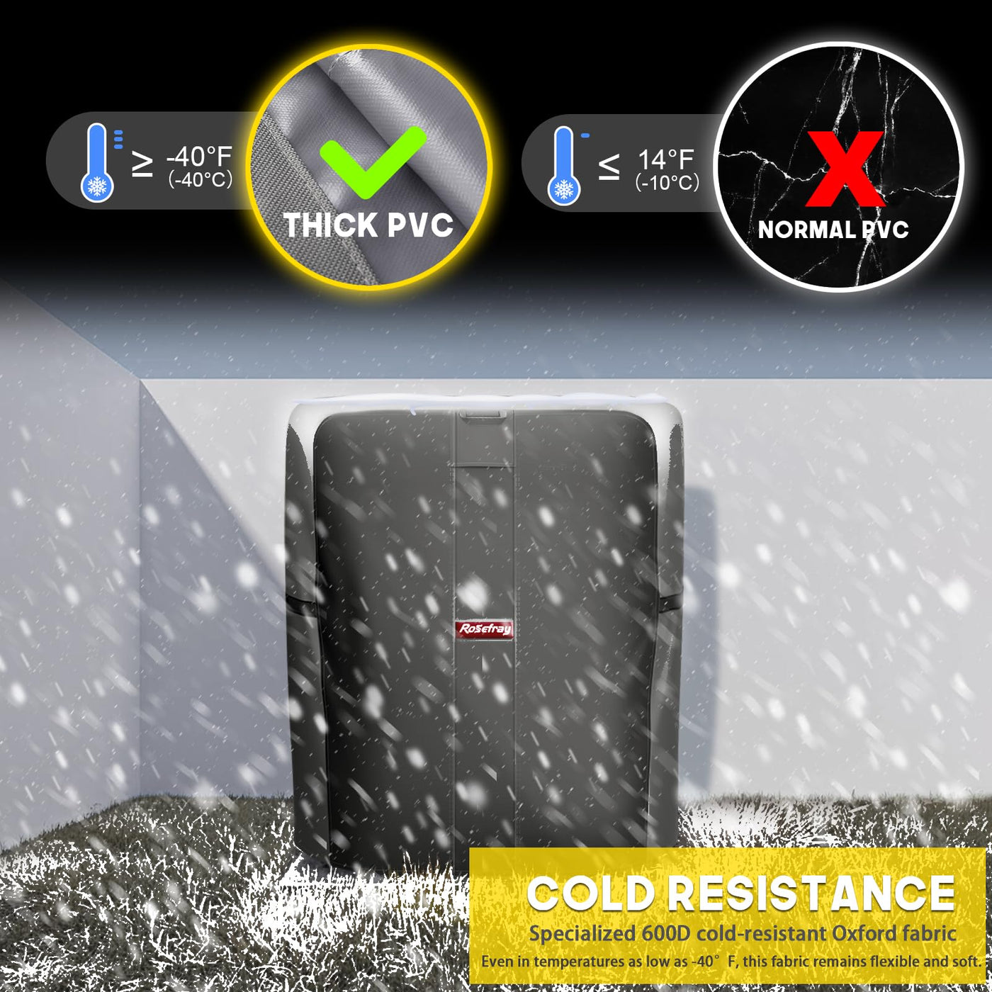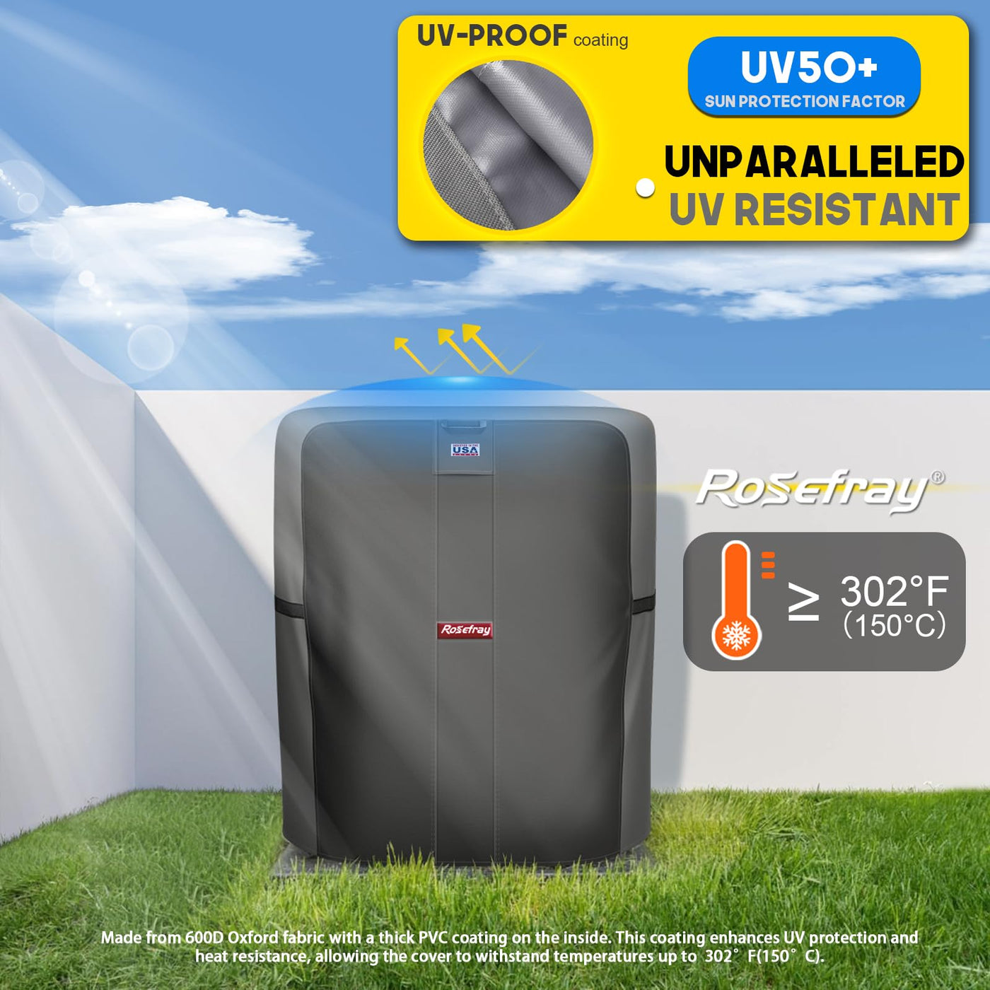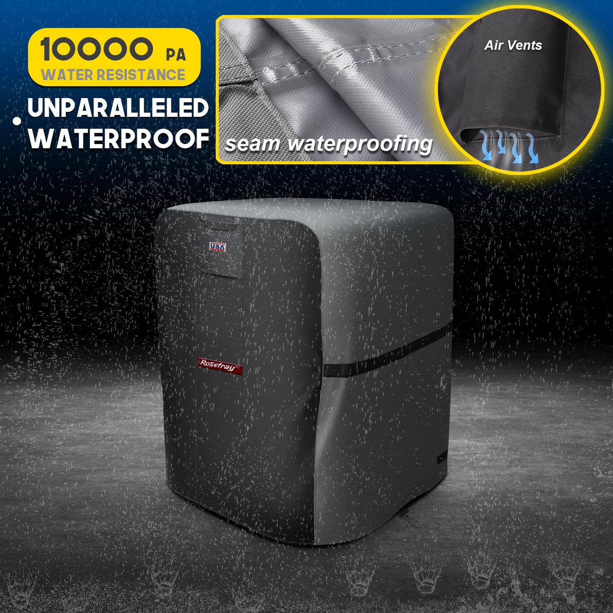 Q: Is the Rosefray AC Cover waterproof?A: Yes, the Rosefray Air Conditioner Cover is made from multi-layer 600D Oxford cloth, which is waterproof and designed to withstand rainstorms. The seams are also glued to enhance waterproof capabilities, ensuring your AC unit remains dry and protected.