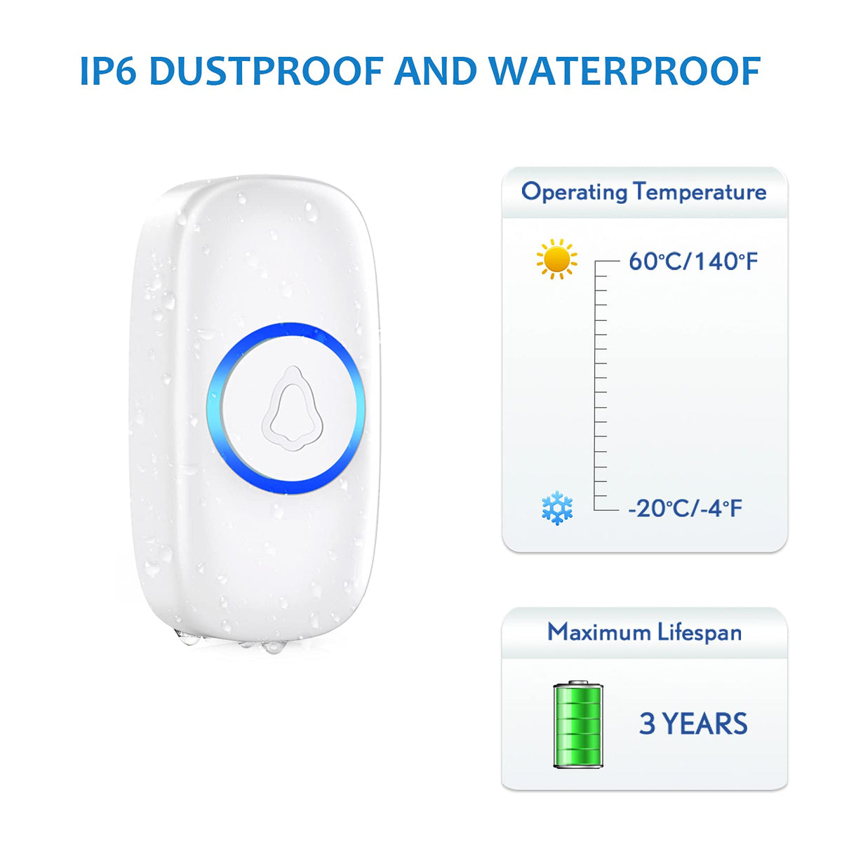 Q: Is the SECRUI Wireless Doorbell suitable for outdoor use?A: Yes, the SECRUI Wireless Doorbell is IP55 rated, making it waterproof and dustproof, which allows it to withstand various outdoor conditions.