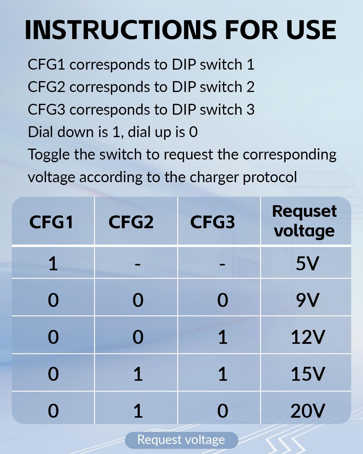Q: Can I adjust the voltage on the Seloky USB-C PD Trigger Module?A: Yes, the module features a convenient DIP switch that allows you to adjust the output voltage from 5V to 20V, providing flexibility for testing different devices.