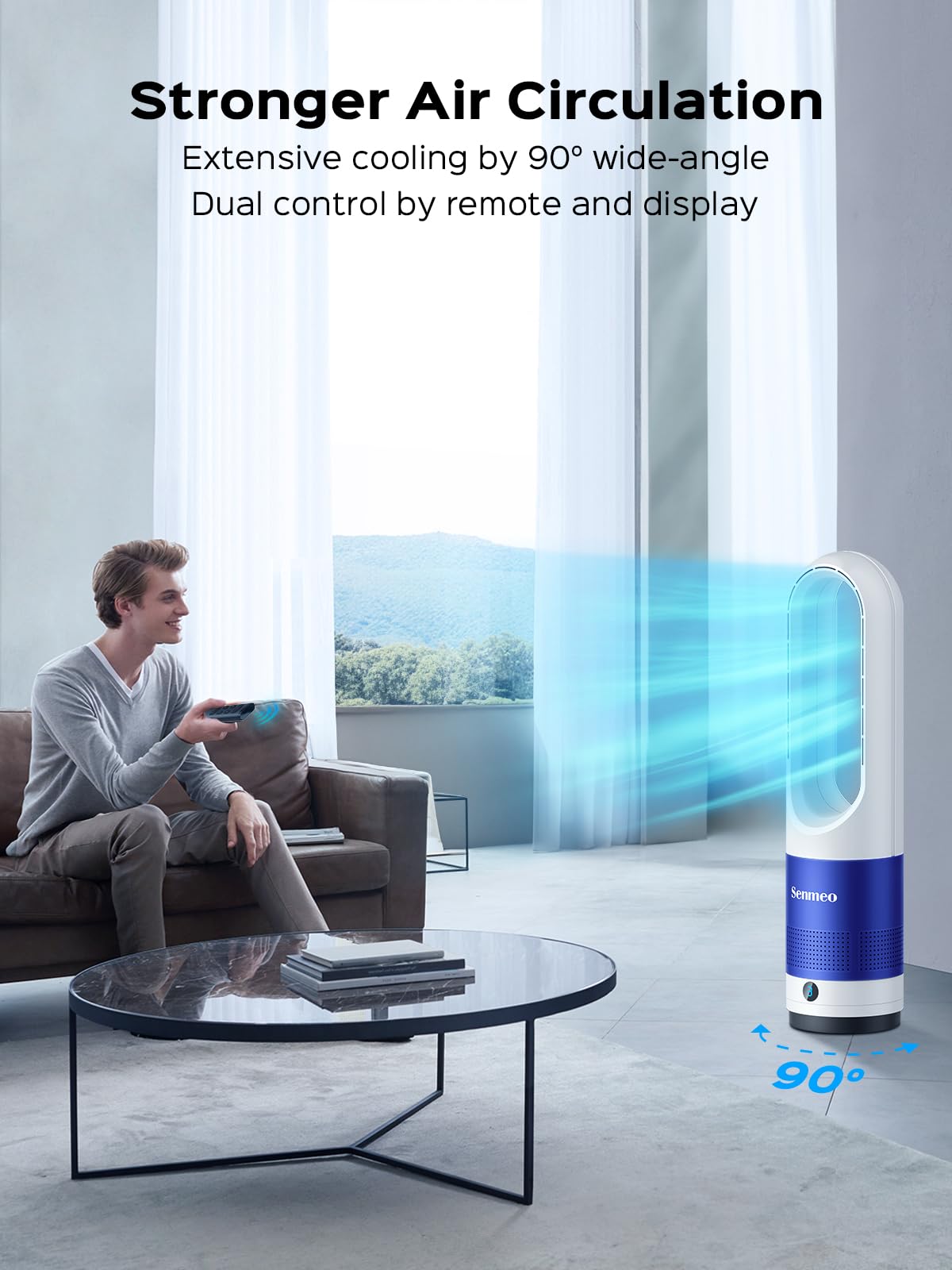 Senmeo'S Bladeless Fan With Remote Control Oscillates Smoothly To Circulate The Air, Thereby Obtaining A Stable And Cool Airflow. This Floor-Standing Bladeless Tower Fan Has An 8-Speed, 90 Oscillation Function, And Is Ingeniously Designed For Any Home Or Office. This Tower Fan Is Equipped With Led Display And Customized Intelligent Control, Which Is Very Easy To Operate. Using The Wireless Remote Control, You Can Comfortably Control The Oscillation, Fan Speed, Built-In Timer Or Turn Off The Fan In Your Home Office, Sofa Or Bedroom. 1. < B >Bladeless Design Concept< /B > No Rotating Blades, To Ensure Safety While Effectively Saving Cleaning Time. 2.< B >8 Wind Speeds & 90 Wide-Angle Air Supply< /B > 8 Wind Speeds For A Customized Comfort Experience.The Wide Swing Angle Of 90 Can Distribute Fresh And Clean Wind, Keeping Everyone Fresh And Cool In The Hot Summer. 3.< B >1-9H Sleep Timer & Noise As Low As 35 Db< /B > The Auto-Off Timer Allows You To Set The Fan To Automatically Turn Off Within 1 To 9 Hours. The Noise Level In Sleep Mode Is Almost 35 Db, Allowing You To Fall Asleep Perfectly After A Long Day Of Work. 4.< B >Smart Remote Control & Led Touch Screen< /B > This Tower Fan Is Equipped With Led Display And Customized Intelligent Control, Which Is Very Easy To Operate. You Can Comfortably Control The Wind Speed In Your Home Office, Sofa Or Bedroom. 5.< B >Compact Design & No Assembly Required< /B > The Fan Features A Sleek And Elegant Compact Design That Requires No Assembly, Saving You Installation Time And Hassle. The Arched Design Is Easy To Grip And Move To Different Rooms. 6.< B >Best Partner For Air Conditioners< /B > If Used In Conjunction With An Air Conditioner, Our Bladeless Fan Can Quickly Spread The Air-Conditioning Throughout The Room. Greatly Reduce Your Electricity Bills And Consume Only 0.8 Kilowatts/Hour Per Day. < B >Package Included< /B > 1 X Senmeo Tower Fan 1 X Remote Control 1 X Cr2025 Lithium Battery 1 X User Manual