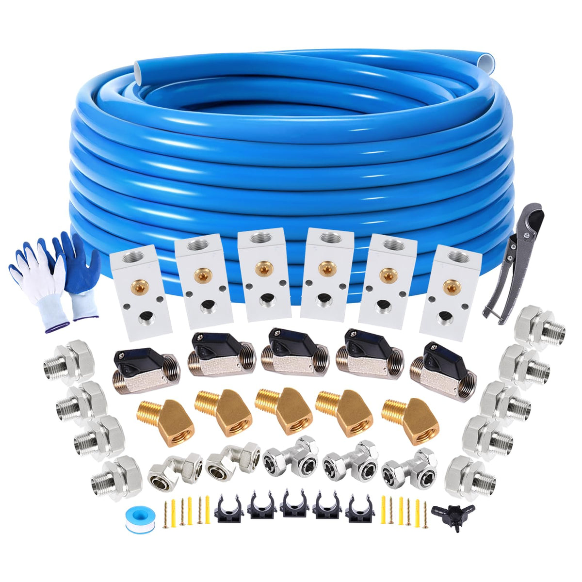 This Air Line Kit Contains Everything You Need To Complete Your Compressed Air Pipe System, Such As Tee Fittings, L Tubing Fittings, Aluminum Blocks With Brass Values, Tubing Cutter, Piping Fixing Clips, Teflon Tape, Air Hose And So On. This Comprehensive Package Saves You Time And Effort, Ensuring A Hassle-Free Installation.