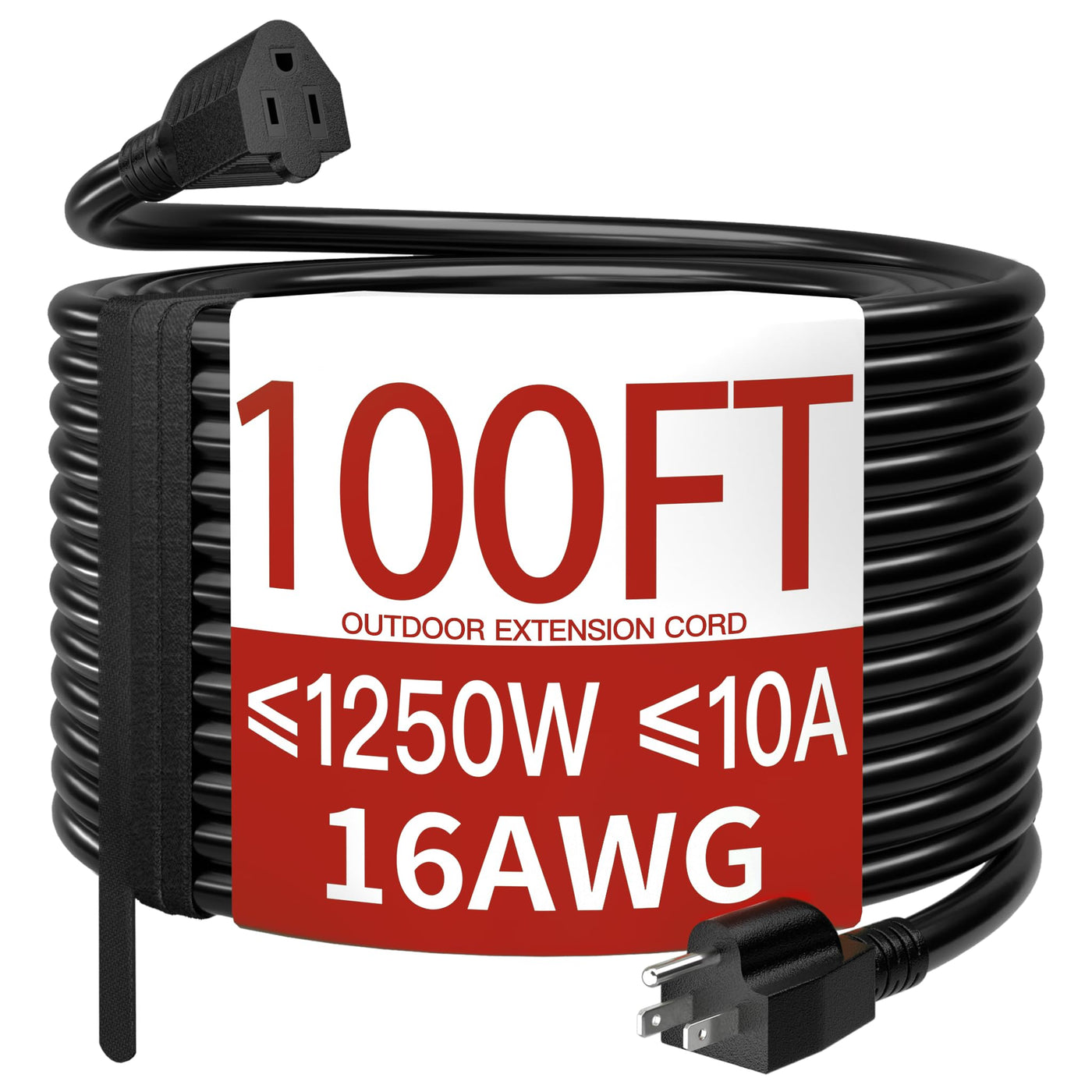 Certified And Trusted: 100 Ft Extension Cord Rated 10 Amps, 1250 Watts And 125 Vac; Male Nema 5-15P And Female Nema 5-15R; It Is Etl/Cetl Listed; Ensuring Its Compliance With Strict Safety Standards; Each Outdoor Extension Cord Passes A 2500V High Voltage Test Before Leaving The Factory To Ensure Safety; Reliability And Efficiency Outdoor Extension Cord Waterproof Are Capable Of Meeting Most Electrical Needs Durable Construction: Black Outdoor Extension Cord Are Made Of 3 Strands Of Pure Copper Core With Thicker Insulation In The Middle And Ip65 Vinyl Outer Jacket; The Pins Of The Extension Cord 100 Ft Male Plug Are Made Of Special Material That Will Not Rust Or Corrode; The Vinyl Outer Jacket Is Flame Retardant, Ip65 Waterproof, -58F Cold And Corrosion Resistant Weatherproof & Abrasion-Resistant: 100Ft Extension Cord Designed To Withstand The Elements; 100 Foot Extension Cord Is Waterproof And Weatherproof; Confidently Use Black Extension Cord Outside Without Worrying About Damage Caused By Wind, Sun Uv,Rain, Snow, Or Extreme Temperatures; It'S Abrasion-Resistant To Combat Drag When You'Re On Rough And Rugged Surfaces Versatile And Convenient: 100' Extension Cord Whether Working Outdoors On Garden Lawn, Installing Outdoor Lighting Or Using Power Tools; Indoors Electric Appliance And In Your Personal Craft Studio Using Power Tools Black Extension Cord Outdoor Will Provide The Convenience And Practicality You Need Practical Design: Plug And Socket Are Designed With Long Strain Relief At The End; 100 Ft Extension Cord Outdoor Pass 20,000 Large-Angle Bends Without Breaking Prolonging Service Life; Outdoor Extension Cord 100 Ft Remain Soft And Flexible At Low Temperatures; Preventing Them From Freezing Hard And Breaking In Cold Environments; Soft Power Cord With Attached Storage Straps For Easy Storage After Use To Avoid Clutter