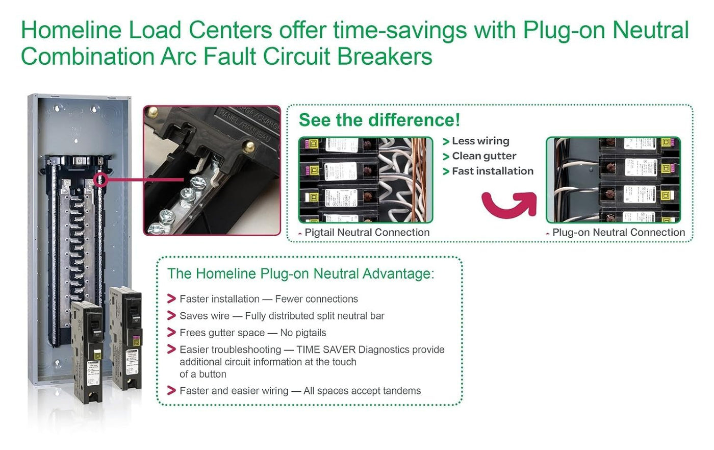 Q: What advantages does the innovative neutral connection design provide?A: The innovative neutral connection design of the Square D HOM120PCAFIC leads to fewer overall connections, which not only speeds up installation but also enhances the reliability of the electrical system.