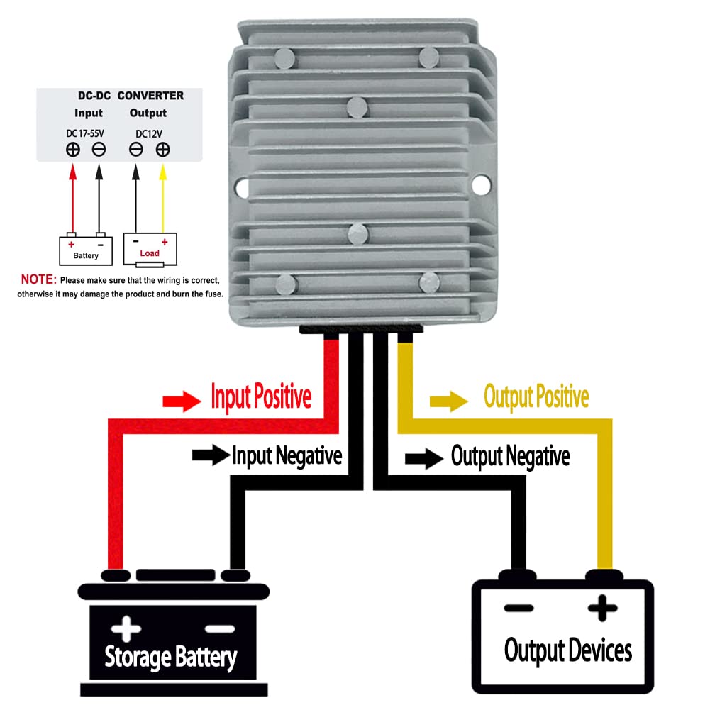 The Dc To Dc Converter(18V To 12V Step Down Converter)Use High Thermal Conductivity Organic Silica Gel Filling And Sealing Technology, They Have Wide Input Voltage, Low Power Consumption, High Efficiency, High Reliability, Compatible With A Variety Of Automatic Protection Functions, Over-Current, Short Circuit, Overheating, Waterproof, Moisture-Proof, These Unique Features Make Our Power Converter Regulator Widely Used In Buses, Medium Buses, Large Trucks, Motors, Gps Navigation, Solar Energy, Photovoltaic Energy Bus Display, Cab Advertising Screen, Car Audio, Lcd Tv, Led, Intercom And Surveillance System. Golf Carts, Speakers, Gps, Led Car Displays, Air Conditioners, Electric Fans, Dvds, Industrial Equipment, Etc Professional Circuit Design, Featuring High Integration And Solid Hardware Materials. Ip68 Waterproof Module Aluminum Alloy Housing Improves Better Heat Dissipation And Ruggedness, Extending Service Life Input Transient High Voltage Protection Output Over-Current Protection Chip Overheat Protection High Temperature Resistance And Super Stability Intelligent Protection Using Intelligent Chip Assembly - With Over-Current / Overload / Low Load / Short Circuit / Overheat Intelligent Protection Function Synchronous Rectifier Circuit Uses Mosfet Instead Of Rectifier Diode, Which Greatly Reduces The Loss Of Rectifier And Improves The Efficiency Of The Converter High Efficiency Conversion, Conversion Efficiency Up To 96% The Load Connected To The Output Of The Power Regulator Should Not Exceed The Maximum Listed Load Power, Any Higher Rated Load Will Cause Damage To The Power Regulator Please Connect The Converter And Your Device According To The Wiring Diagram Provided Connection Method: Input: Red (+) Black (Gnd)&Nbsp; &Nbsp; &Nbsp;&Nbsp; Output: Yellow (+) Black