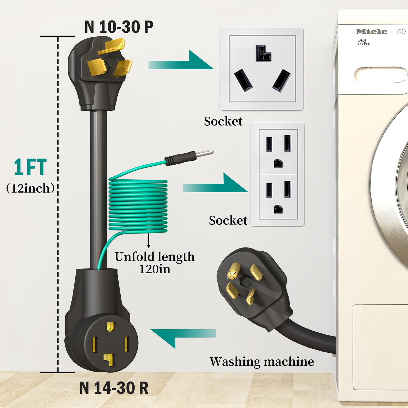 1Ft 3 Prong To 4 Prong Dryer Plug Adapter With Green Ground Wire, Connects 4-Prong New Dryer Female To 3 Prong Old Dryer Male Receptacle, 10-30P To 14-30R Dryer Adapter, 30A, 250V, Stw 10Awg3C