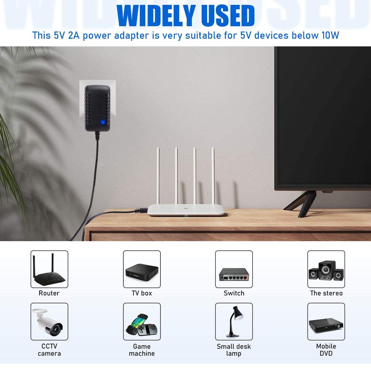 Q: What devices are compatible with the Suacopzar 5V 2A Power Adapter?A: The Suacopzar 5V 2A Power Adapter is compatible with a variety of low-power 5V devices that draw less than 2A, such as CCTV cameras, routers, clocks, printers, LED lights, cordless phones, and set-top boxes. It's essential to check your device specifications to ensure compatibility.