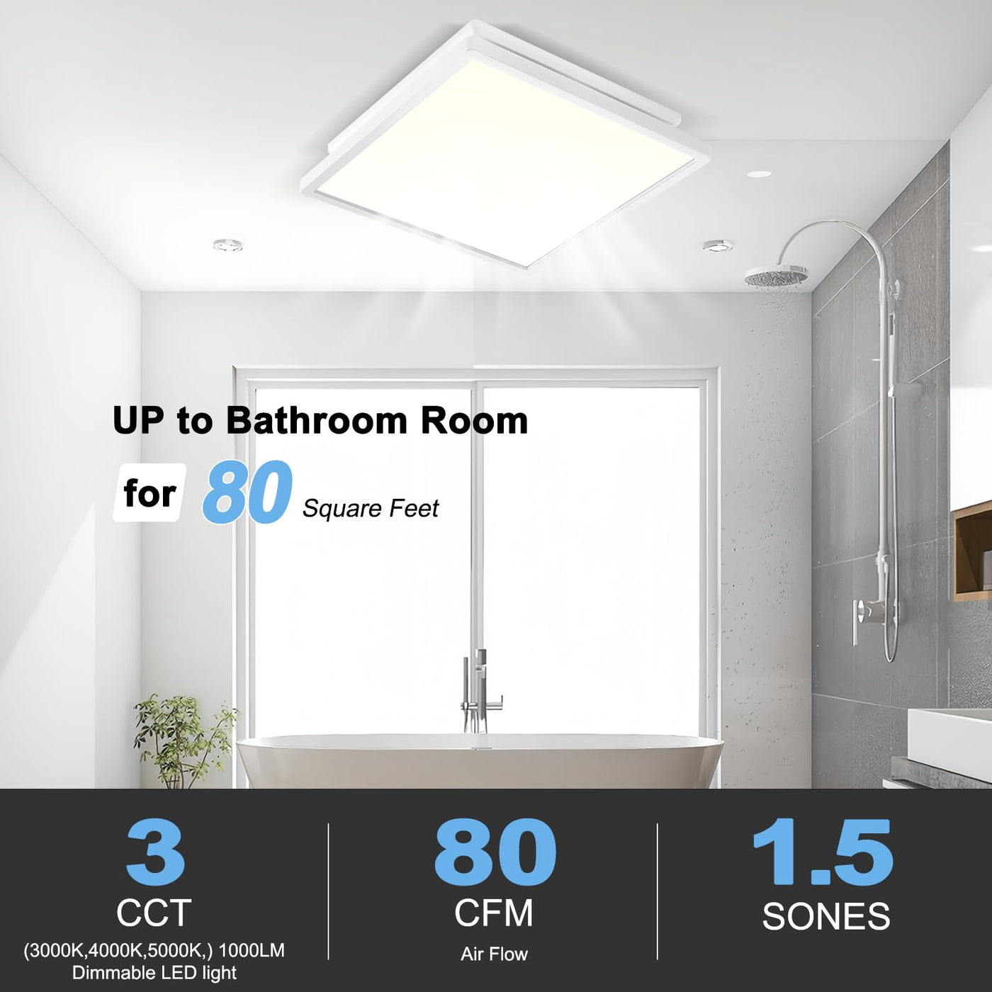 Tech Drive Bathroom Exhaust Fan With Light, 80 Cfm, Super Quiet 1.5 Sone Bathroom Fan With Light, 1000Lm Dimmable 3Cct Led Light
