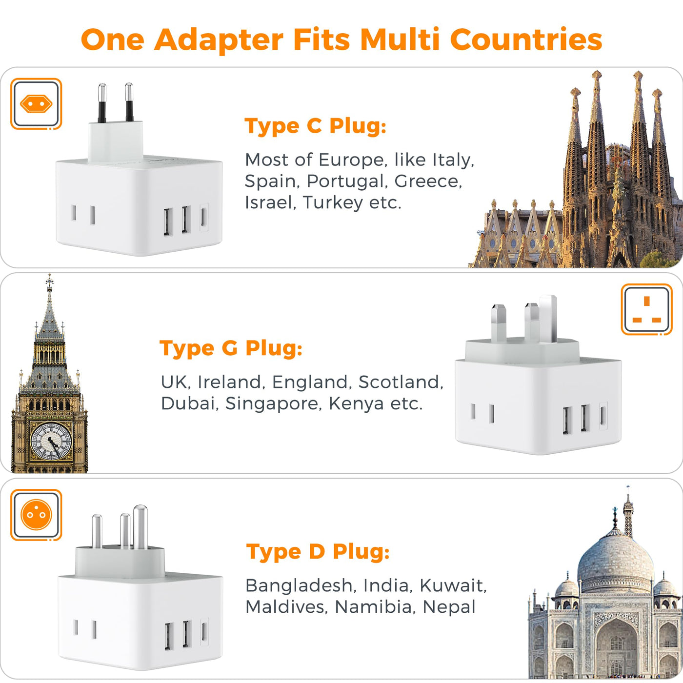 Q: What types of plugs does this adapter support?A: This travel adapter kit includes detachable plugs for Type C (used in most of Europe), Type G (UK, Ireland), and Type D (India, Bangladesh), making it versatile for various travel needs.