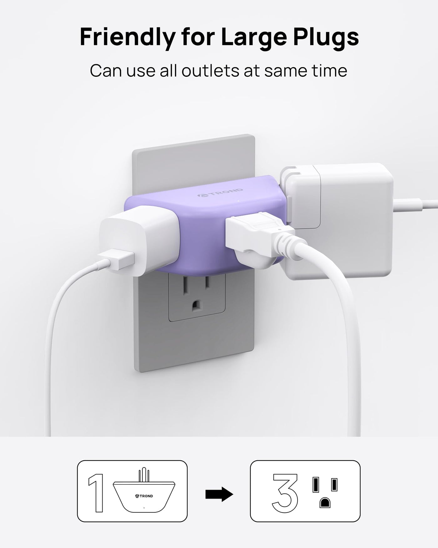 Trond Purple Outlet Extender Plug Splitter With 3 Prong Grounded Sockets, 3 Way Angled Outlet Adapter, Wall Plug Expander, Cru