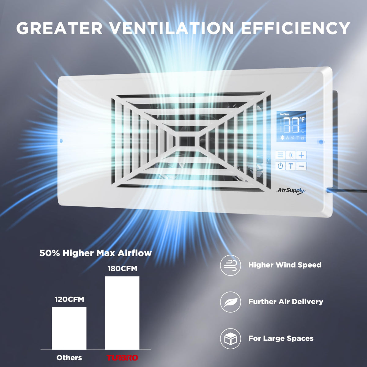 Q: Can I use the TURBRO Booster Fan in large rooms?A: Yes, the TURBRO Booster Fan provides a maximum airflow of 180 CFM, which is 50% more than many other brands. This high-powered airflow is ideal for enhancing air circulation in larger spaces.