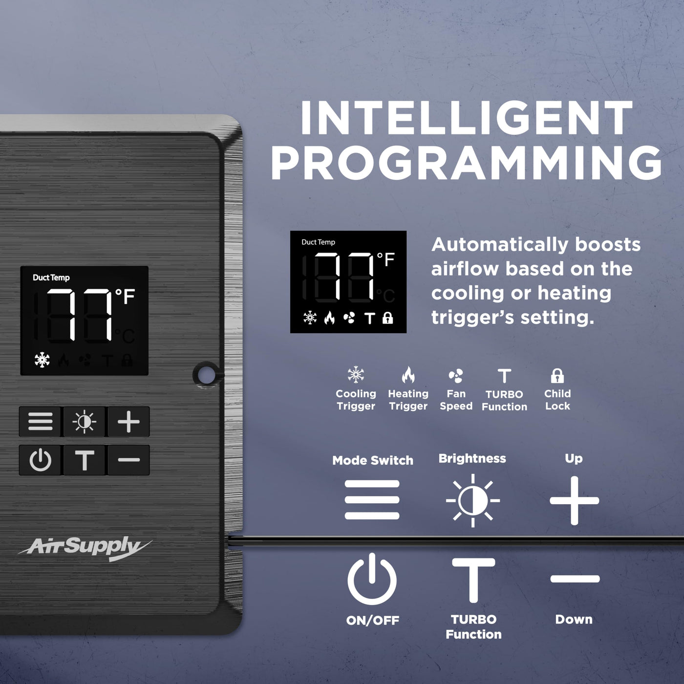Q: What features does the intelligent LCD controller offer?A: The intelligent LCD controller features a built-in temperature probe that allows the fan to react intelligently based on the airflow's temperature. It offers 10 fan speeds and a TURBO function for maximum airflow, making it user-friendly with its programmable settings.