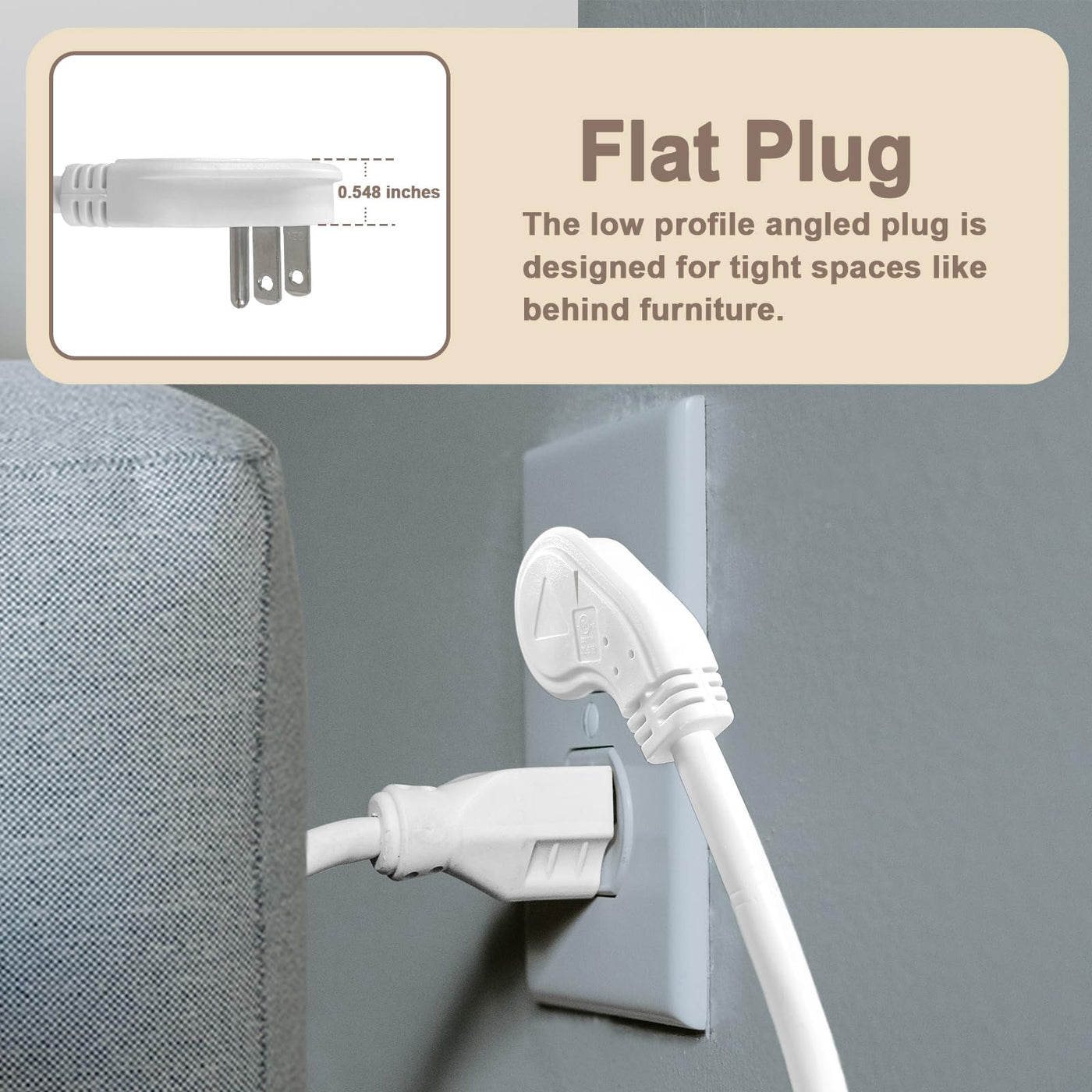 Q: How does the flat plug design benefit me?A: The flat plug design allows for greater flexibility in tight spaces, enabling you to plug in devices without blocking the adjacent outlet.