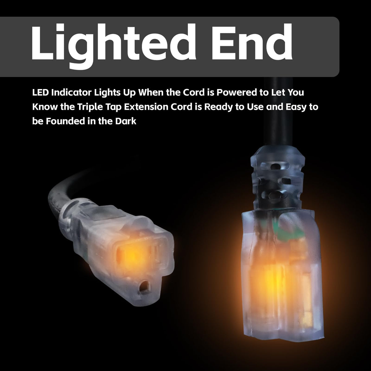 Q: How does the lighted indicator on the extension cord enhance usability?A: The lighted indicator on the extension cord illuminates when the cable is powered, allowing users to easily verify its readiness for use. This feature is particularly useful in low-light conditions, ensuring the cord can be quickly located and safely operated.