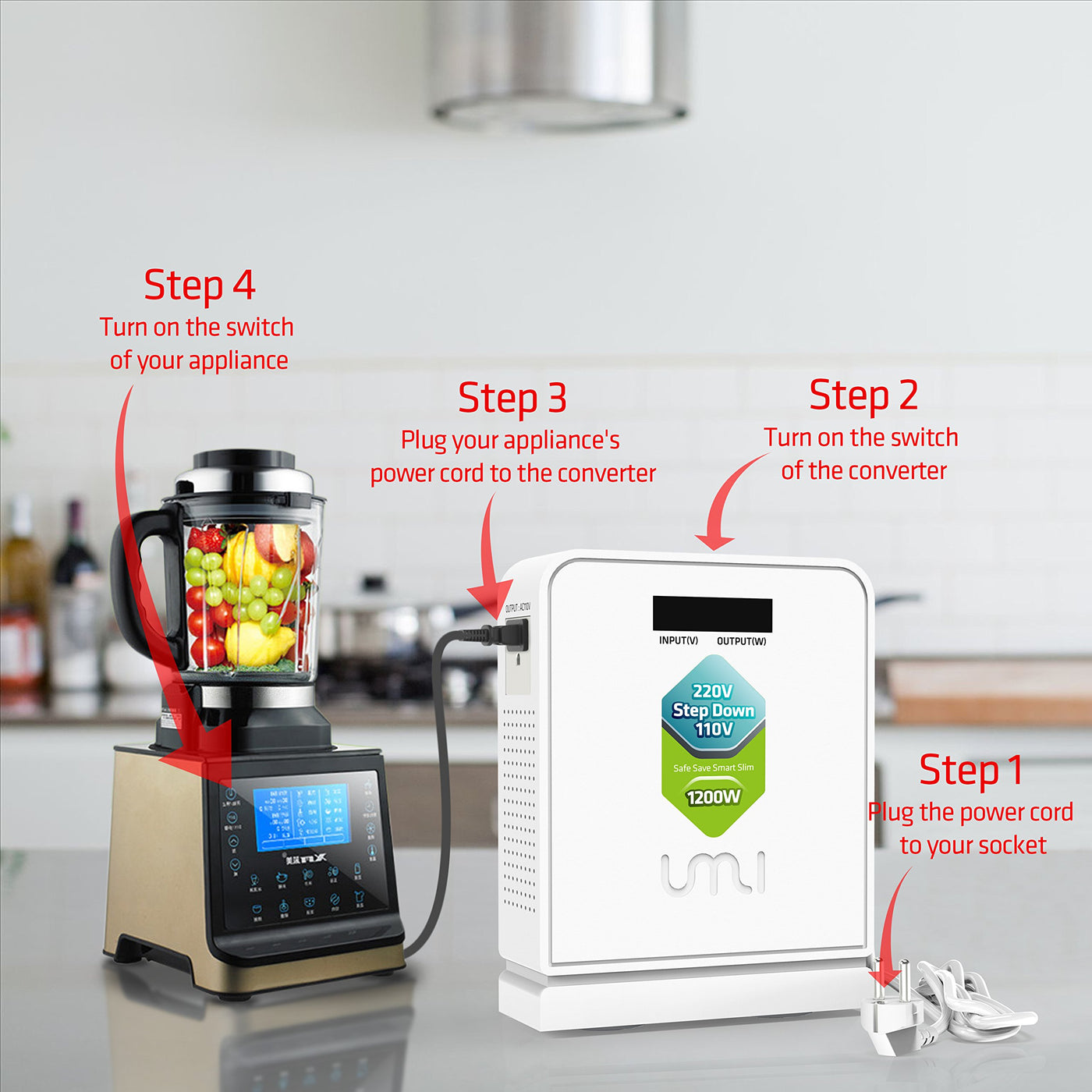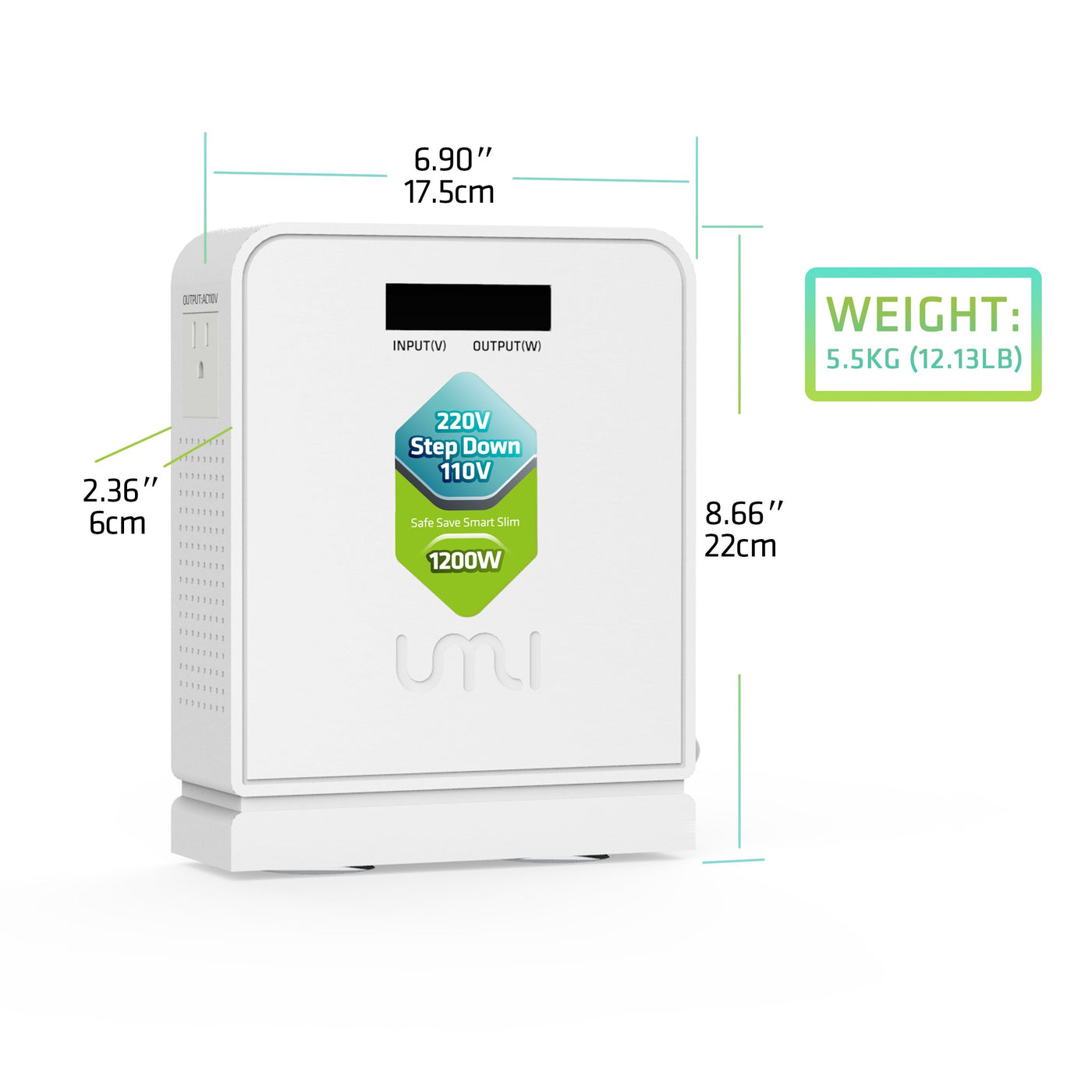 Product Description: Umi Voltage Converter Lx-1200 Sd, Is Designed For Step Down Voltage Converter From 220V To 110V, Which Is Suitable For Appliance With 100V-120V Rated To Be Used In Those Countries With 220V-240V Supply: Input: 220V-240V Output: 100V-120V Frequency: 50/60Hz Load Capacity: 1200Watts For Umi Lx Series Voltage Converter, There'Re Great Features: There'S Indicator Showing Input Voltage And Output Power, Easy To Know The Actual Status; Light And Ultra Thin, Fashion Style Design, With The Very Modern Snow White Shell, The Product Is Simple, Stylish And Full Collocation With Home Fashion; Plastic Shell Insulation Leakage Protection, No Worry Electric Shock; The Featured Design With Toroidal Transformers, Having The Prouducts To Be Slim And Smart, High Efficiency, Energy Saving, Safety. There'S Sextuple Security Protections: Overloading Pretection/Alarm, Fuse Short Circuit Protection, Overheating Protection, Waterproof For Turn On Switch, And The Heat Resistance Level Of The Insulation Material Of The Toroidal Transformer Is Over 900 Degree. It'S A Perfect Home Unit For Your Electronics With 100V-120V To Be Used In Your Country With 220V-240V Supply Based On It'S Durable Quality And Powerful Functions. Voltage Transformer Purchasing Guide: Prior To Purchasing A Voltage Transformer, In Order To Avoid Users' Frustrations And Unnecessary Returns, It'S Imperative To Check And Verify What Your Appliance'S Maximum Power Consumption (Mpc) Is, Which Could Be Located On The Device'S Nameplate Or Included In It'S User Instruction. The Appliance'S Mpc Must Be Less Than This Transformer'S Maximum Load Capacity (Mlc), Or It Will Not Work. For Safety Concerns And Optimal Results, The Manufacturer Recommends That The Transformer'S Mlc Should Be Equal Or Greater Than Your Appliance'S Mpc.