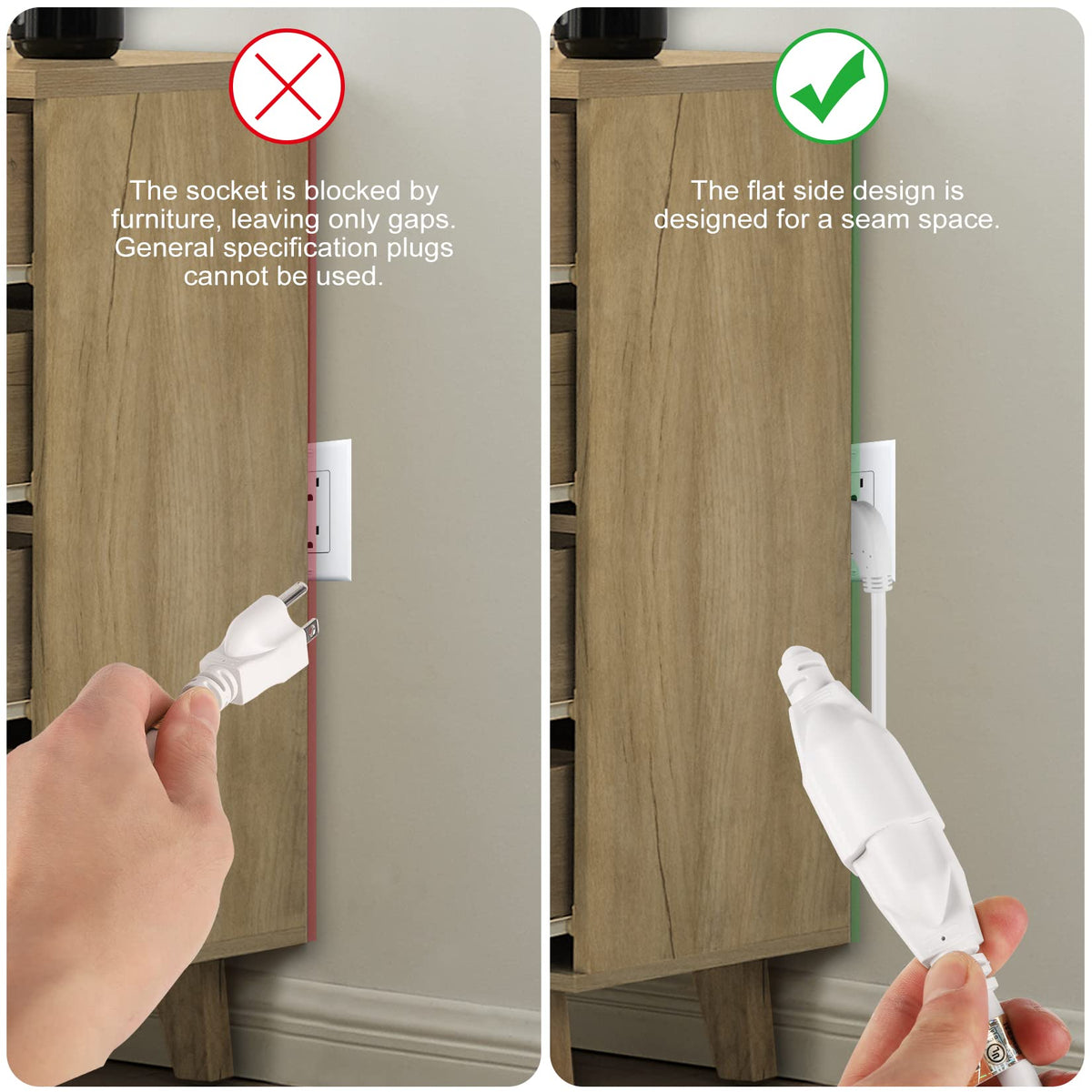 Q: How does the flat plug design benefit me?A: The flat plug design features a 90-degree angle, which saves space and allows you to plug it into tight spots without blocking other outlets.