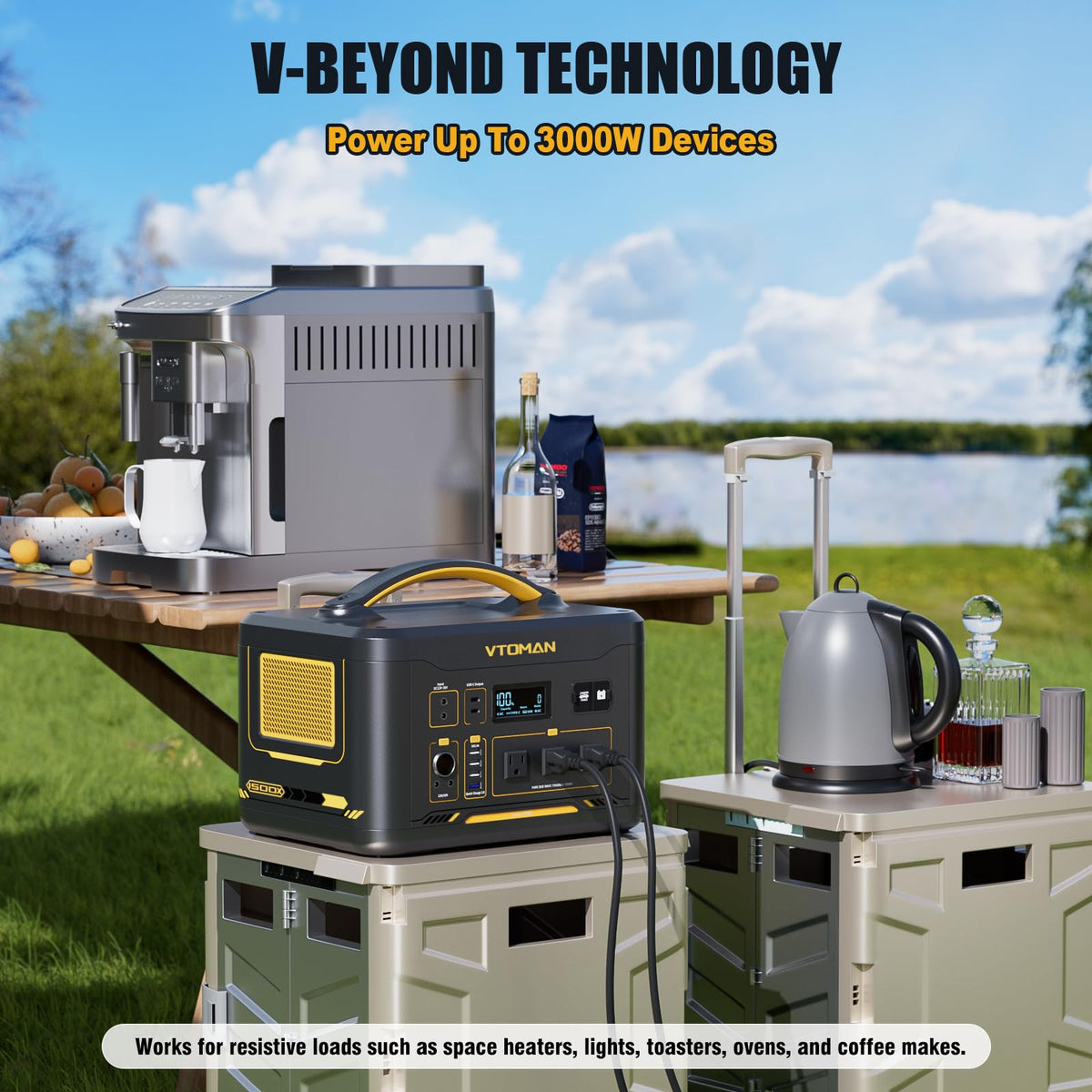 Q: What devices can I power with the VTOMAN 2376Wh Portable Power Station?A: The VTOMAN Portable Power Station can power a variety of devices with its peak output of 3000W. This includes electric grills, coffee makers, laptops, smartphones, and other essential devices for outdoor adventures or home backup.