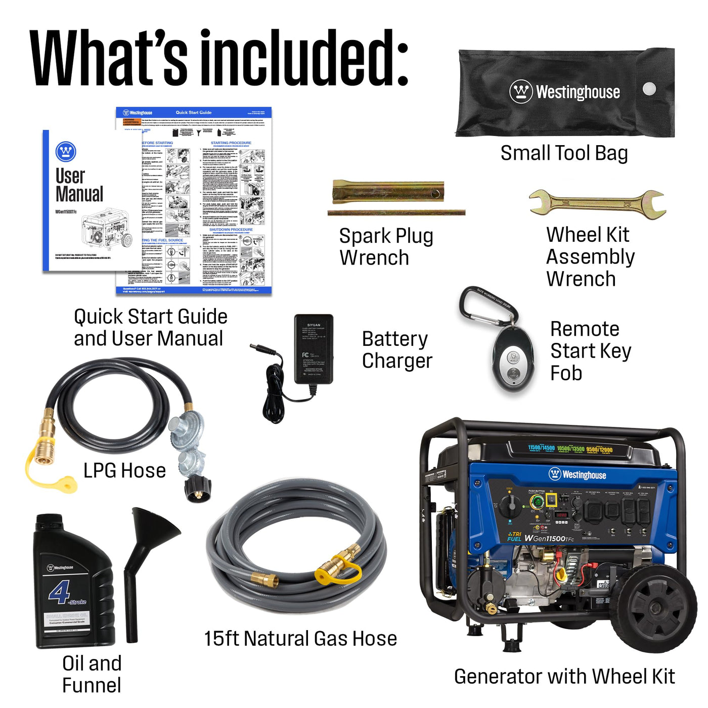 The Westinghouse Wgen11500Tfc Tri-Fuel Portable Generator With Co Sensor Produces Up To 14,500 Peak Watts And 11,500 Running Watts, The Wgen11500Tfc Is A Tri Fuel Generator That Operates On Gasoline, Propane (Lpg), Or Natural Gas. The Heavy Duty 550Cc 4-Stroke Ohv Westinghouse Engine Is Constructed Of A Durable Cast Iron Sleeve And Runs For Up To 19 Hours On A 9.5 Gallon (36 L) Gas Tank, Keeping You Powered Through The Day With Built-In Fuel Gauge, Automatic Low Oil Shutdown, And Gfci Outlets. Push-Button Electric Start Makes Starting The Wgen11500Tfc Effortless While The Remote Start Key Fob Offers Added Ease From A Distance. Its Intuitive Control Panel Spotlights The Transfer Switch Ready L14-30R And Larger 14-50R To Power Your Major Appliances Like The Air Conditioner, Refrigerator, And Sump Pump As Well As Any Lights Or Entertainment Centers All At The Same Time With A Single Cord Hookup. Vft Data Center Displays Volt Output, Frequency, And Lifetime Hours To Keep You Up To Date With Real-Time Information And Regular Maintenance. Conveniently Portable With An Included Set Of Heavy Duty Never-Flat Wheels, Handle, And Lift Bracket, It'Ll Have Your House, Travel Trailer, Or Jobsite Powered In Seconds. The Wgen11500Tfc Is Complete With A 3-Year Limited Warranty And Lifetime Technical Support Backed By Our Nationwide Customer Service And Support Network.