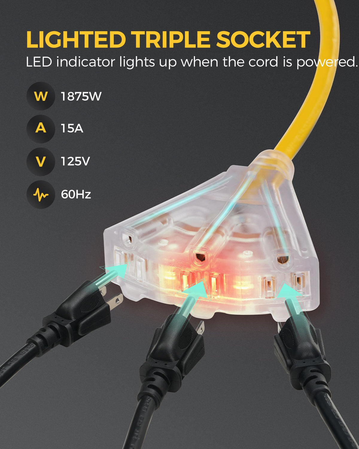 Wilawels Retractable Extension Cord Reel, 40 Ft Heavy Duty Power Cord, 12Awg/3C Sjtow, 3 Grounded Outlets Lighted Triple Tap, 15