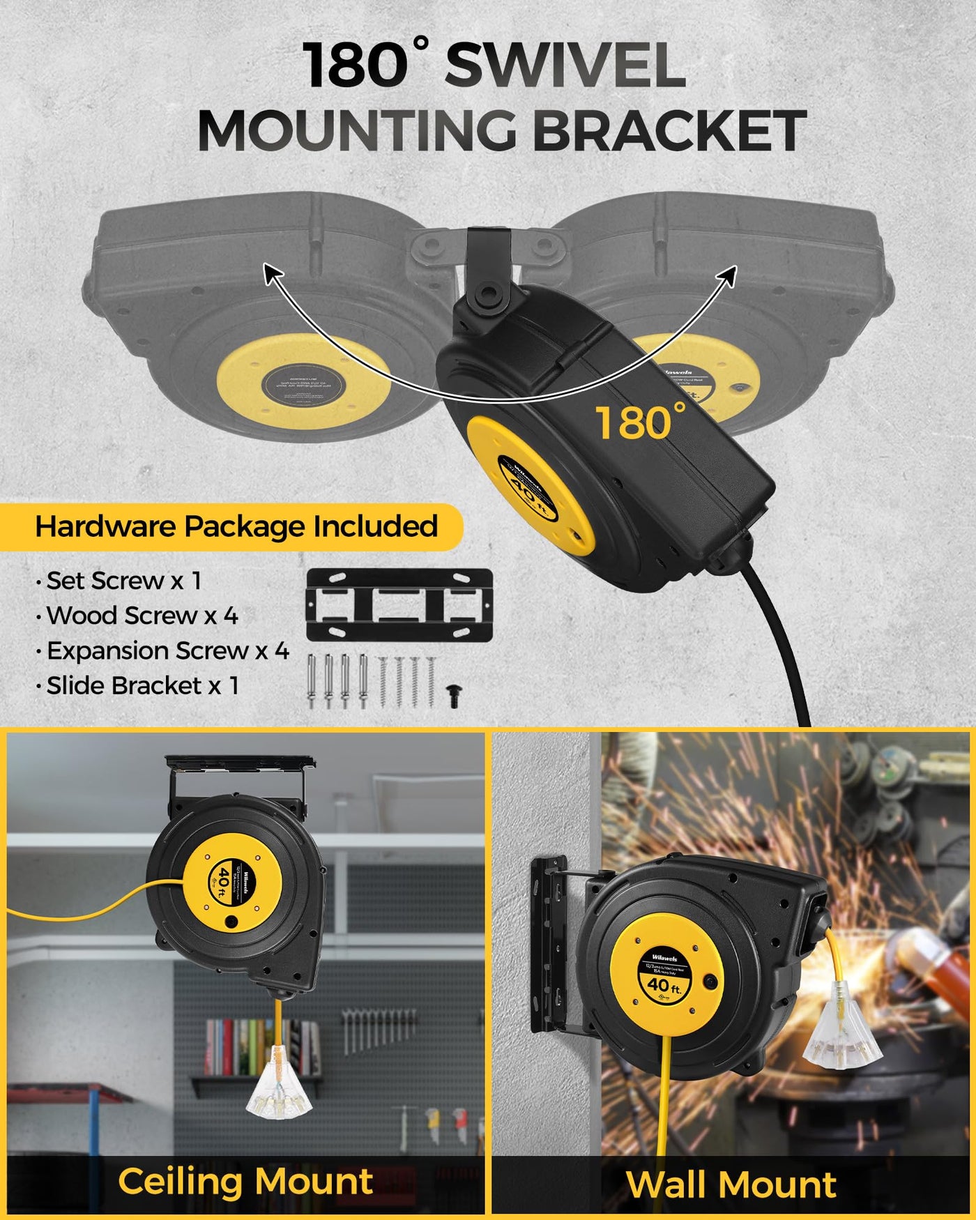 Wilawels Retractable Extension Cord Reel Powers Your Devices Anywhere! Tired Of Messy Cords Around? Use Wilawels Extension Cord Reels For Easy Cord Management. This Cord Reel Includes A 40Ft Extension Cord And A 4.5Ft Lead-In Cord, Making It Perfect For Use In Shops, Garages, Construction Sites And Homes. It Is Ideal For Pressure Cleaning, Landscaping Maintenance, Vehicle Maintenance And More. The Ratcheting Mechanism Allows For Easy Adjustment Of Cord Length, And A Gentle Pull Activates The Retraction System. The Built-In Circuit Breaker Automatically Cuts Off Power Supply When The Total Current Of Connected Equipment Exceeds 15A, Ensuring The Safety Of Both Equipment And Operators. This Heavy Duty Power Cord Is Ul Certified For High Reliability. Get Ready To Power Up And Take Control Of Your Space With Wilawels! Package Contents: - 1 X Retractable Extension Cord Reel - 1 X Accessory Kit - 1 X Instructions Wilawels Notes: - This Electric Cord Reel Is For Use In Dry Environment Only. Please Do Not Use It In Wet Conditions And Keep It Away From Water. - Please Strictly Follow The Instructions For Installation And Use To Ensure That The Mounting Bracket Is Firmly Fixed. - It Is Recommended To Unwind Entire Power Cord When Connecting High-Power Devices To Prevent Overheating. - Please Keep Children Away From Power Sources And Accessories.