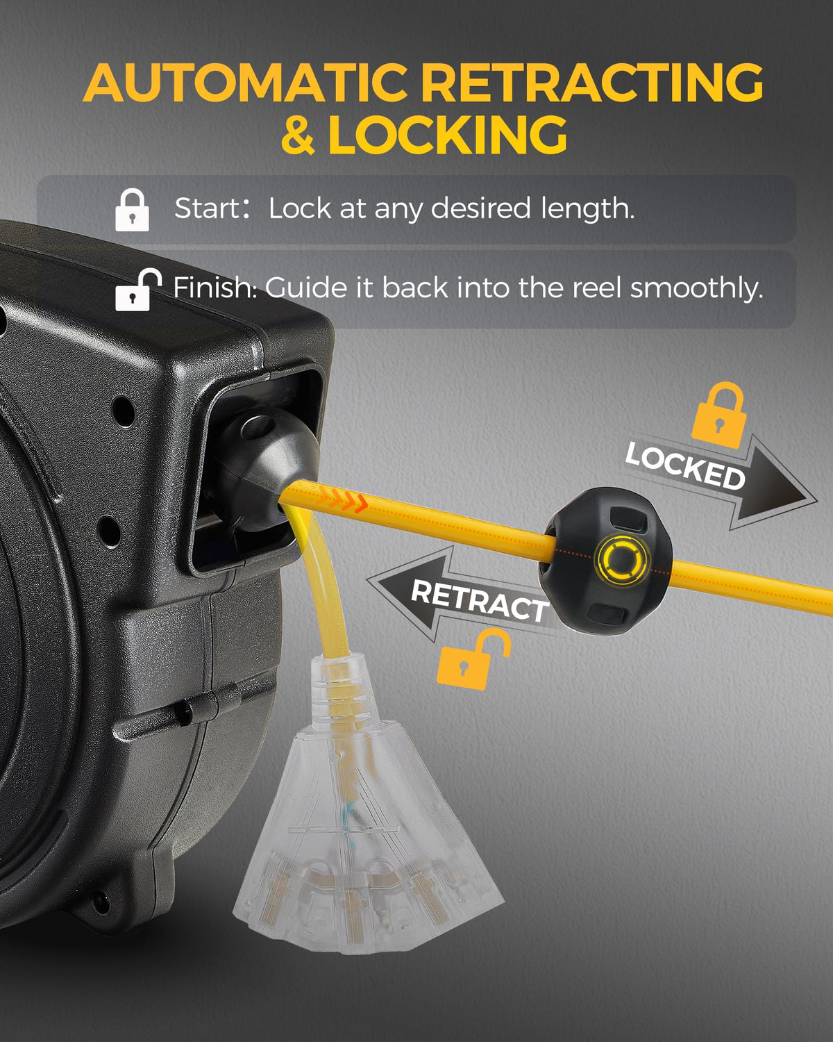 Q: Is this extension cord reel suitable for heavy-duty applications?A: Yes, the heavy-duty design features a 12AWG SJTOW cord that offers excellent oil and water resistance, making it ideal for heavy-duty applications like construction sites and garages.