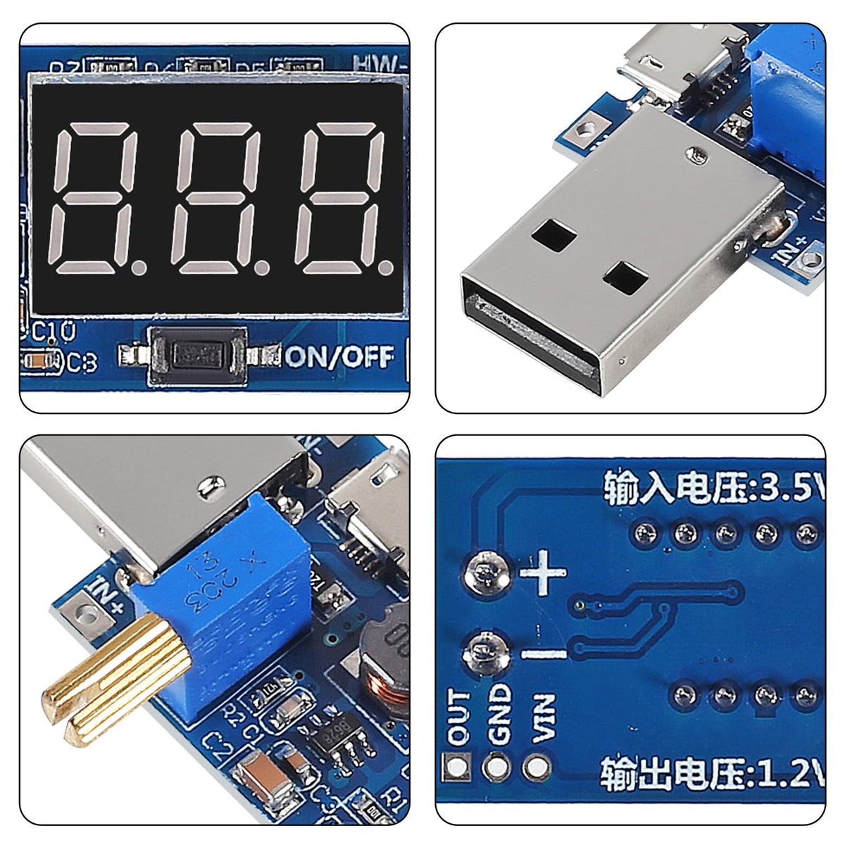 Features: One Button To Turn Off The Output Supply On/Off Display Screen Support Low Power Mode Support Sleep Mode Support Both Standard Usb And Micro Usb And Pads Input Voltage; Potentiometer With Rotating Handle. Parameters: Input Voltage: Dc 3.5-12V Output Voltage:Dc 1.2-24V Input 1.2-2V,Output Power Within 2W Input 2V-20V,Output Power Within 3W Input 20V-24V,Output Power With In 2.5W Display: 3 Bit Digital Tube Display Use Steps: Input Voltage From Standard Usb Or Micro Usb Or Vin+' And Vin-' Turn On Display Screen Adjust Potentiometer To Get The Required Voltage Connect Load Note: It Is Not A High Power Supply, Please Use It Within The Power Range.