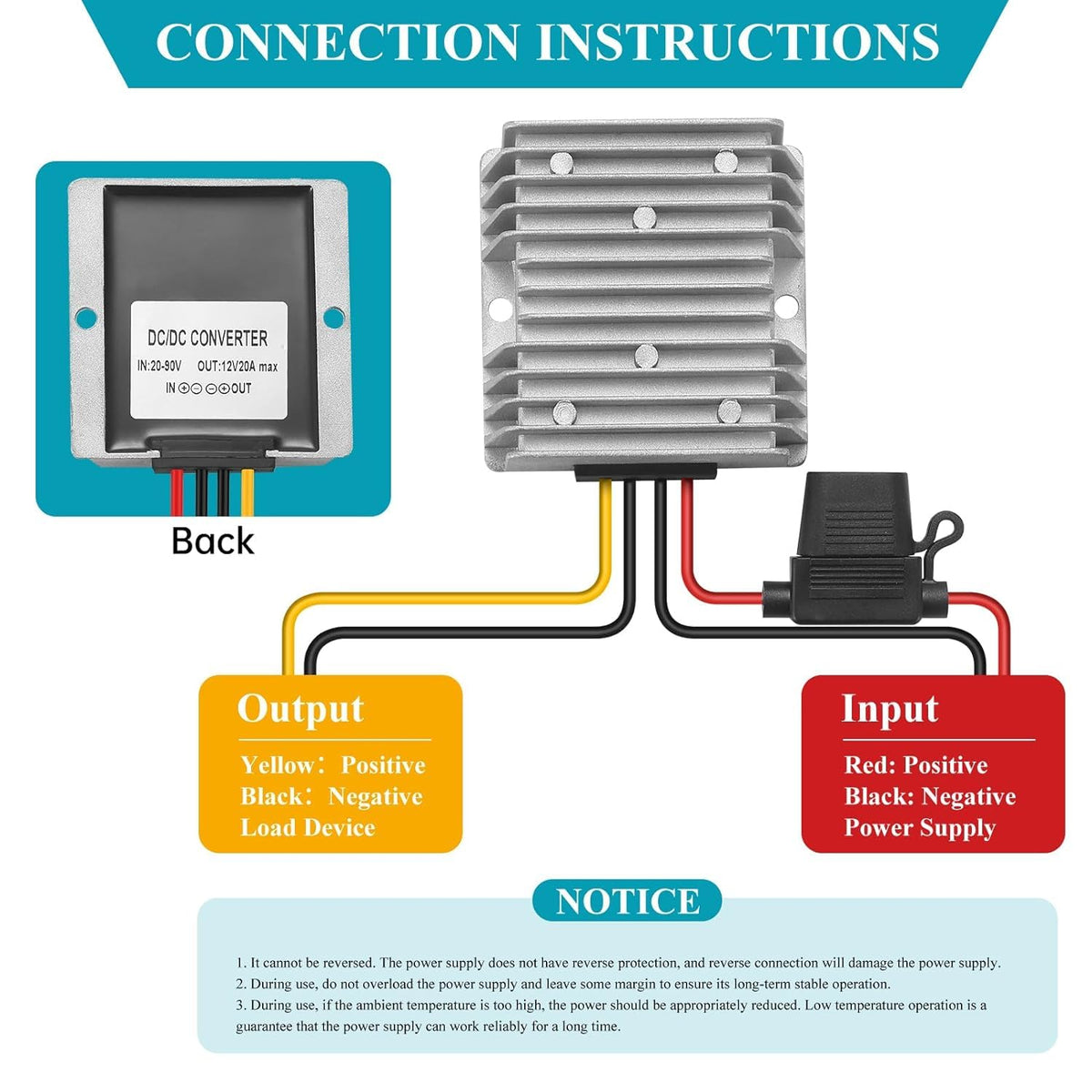 A. Test The Environmental Conditions B. Unless Otherwise Specified, The Tests In This Specification Shall Be Conducted Under The Standard Atmospheric Conditions Tested C. Temperature:15?~35?. D. Relative Humidity: 45%~75% E. The Instrument Accuracy Of The Measured Voltage Shall Not Be Less Than 0.5 Level, And The Internal Resistance Shall Not Be Less Than 10 Ko / V. F. The Instrument Accuracy Of Measuring Current Shall Not Be Less Than The 0.5 Level G. The Accuracy Of The Instrument Used For Measuring The Temperature Shall Not Be Less Than 1? Input Range:20-90V Rated Input Voltage:24/36/48/60/72/84V Transfer Efficiency:95% Incoming Line:15-16Cm(R+ B-) Output Voltage:12V Output:20A Max Maximumoutput:240W Max No-Load Adjustment Rate:2% Load Regulation:3% Quiescent Dissipation:=30Ma Do Not Use It Near A Heat Source (Such As A Fire Or A Heater) Do Not Connect The Input Line To 220V Electricity Do Not Put The Product Into The Fire Or Heat It Do Not Short-Circuit The Positive Or Negative Poles Of The Product With Wires Or Other Metal Objects Non-Professional Personnel Are Prohibited To Disassemble And Repair By Themselves