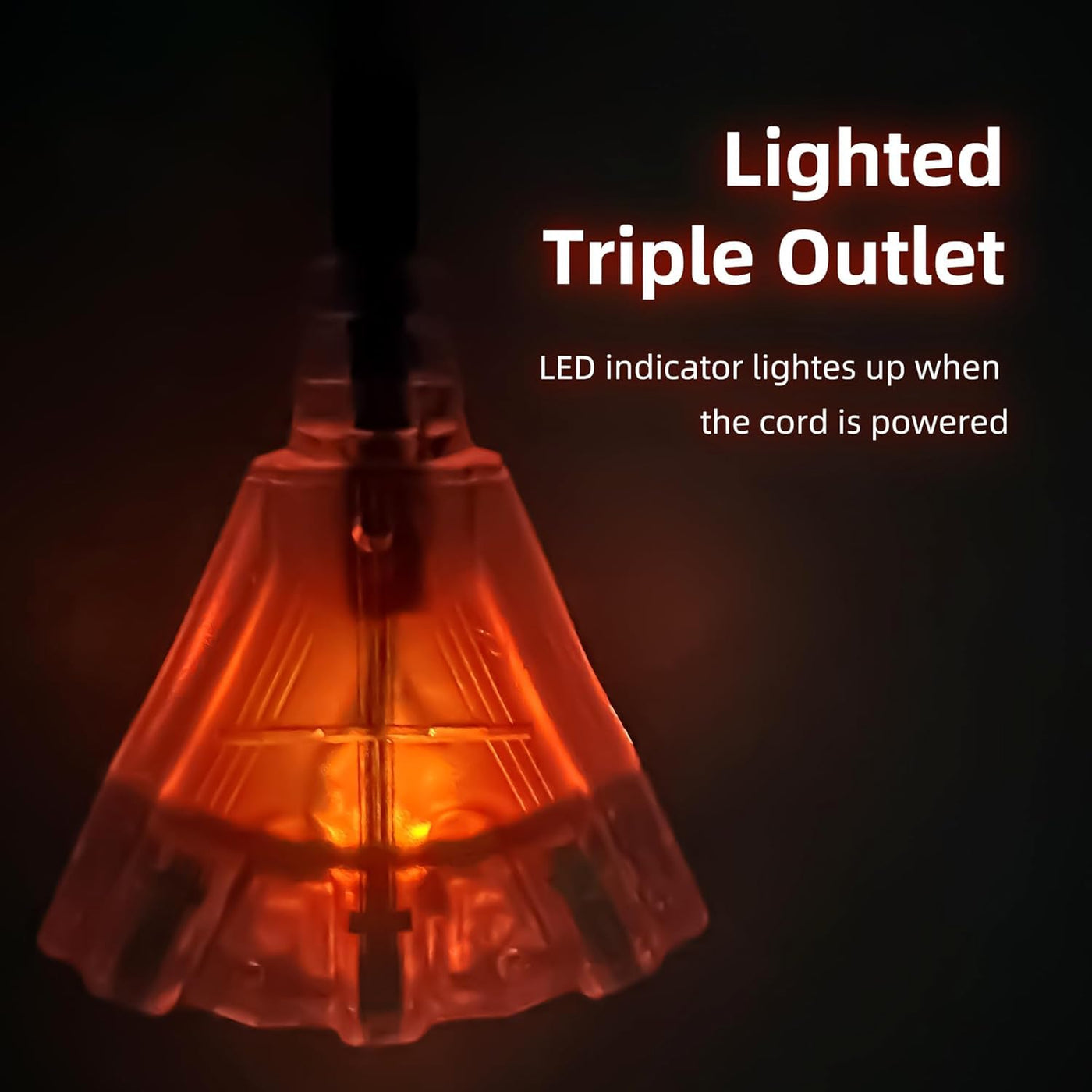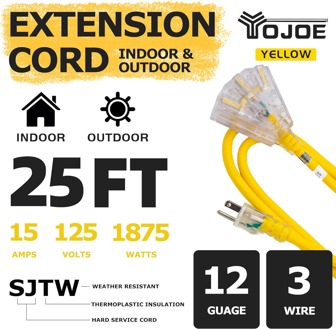 Yojoe 3 Outlets Indoor Outdoor Extension Cord With Lighted End, 3 Prong 15A Weatherproof Power Cord, 12 Gauge Heavy Duty 25 Ft Y