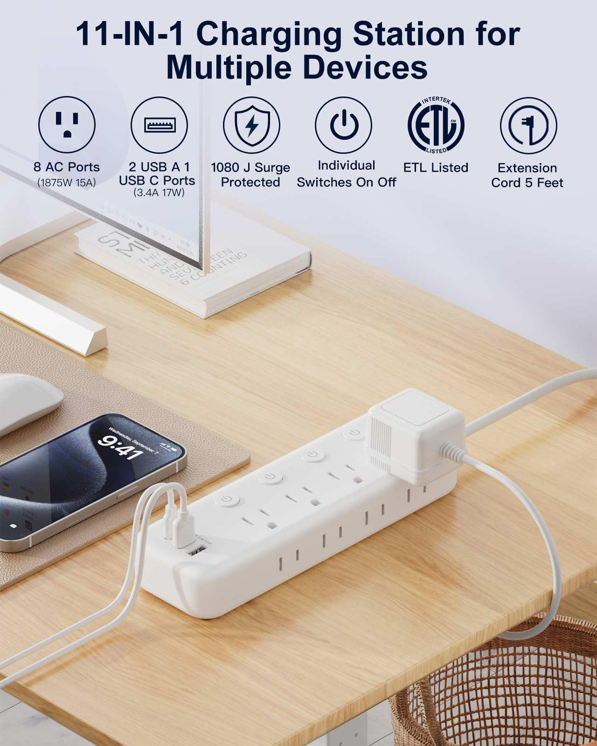 Appliance Extension Cord With Individual Switches On Off - 5 Ft, 1875W Heavy Duty Extension Cord With Usb Ports, 8 Outlets, Circuit Breaker For Microwave, Aquarium, Kitchen, Garage, Etl Listed