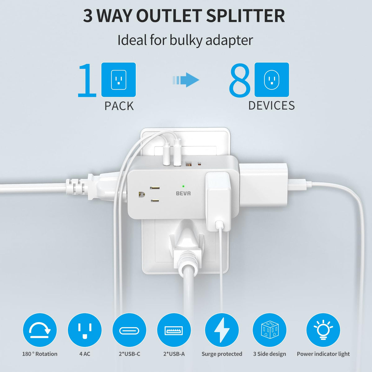 Q: Is the BEVA outlet extender safe to use with appliances?A: Absolutely. The BEVA outlet extender is equipped with surge protection rated at 900 Joules, ensuring that your devices are safeguarded against power surges and fluctuations.