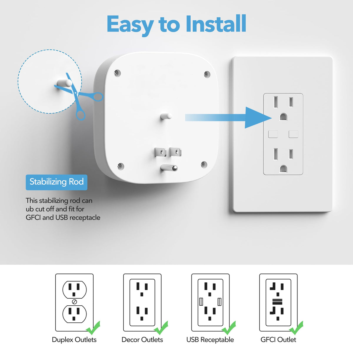 Q: How does the USB charging work on this outlet extender?A: The outlet extender features 2 USB-A ports and 1 USB-C port, allowing for efficient charging. The USB-C port can deliver up to 5V/2.4A, while the USB-A ports also provide a total output of 5V/2.4A, ensuring fast charging for your devices.