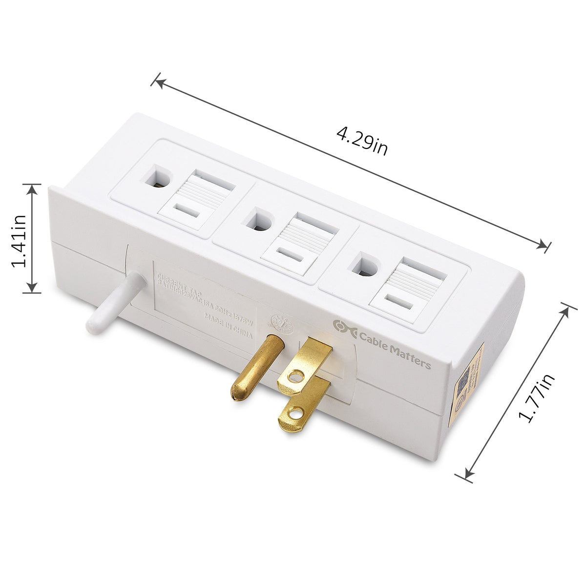 AC Wall Tap Specifications - Electrical Rating: 15A, 125VAC, 60Hz, 1875W - Housing Dimensions (LxWxH): 4.3 x 1.0 x 1.8 Inches