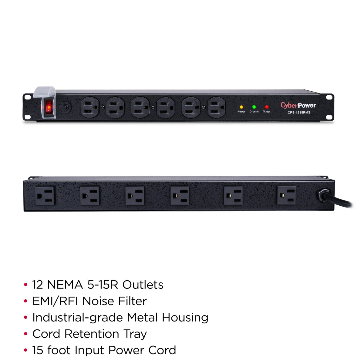 Q: How many outlets does the CPS1215RMS provide?A: The CPS1215RMS comes equipped with 12 surge-protected NEMA 5-15R outlets, with 6 outlets located on the front and 6 on the rear, providing ample connectivity for your devices.