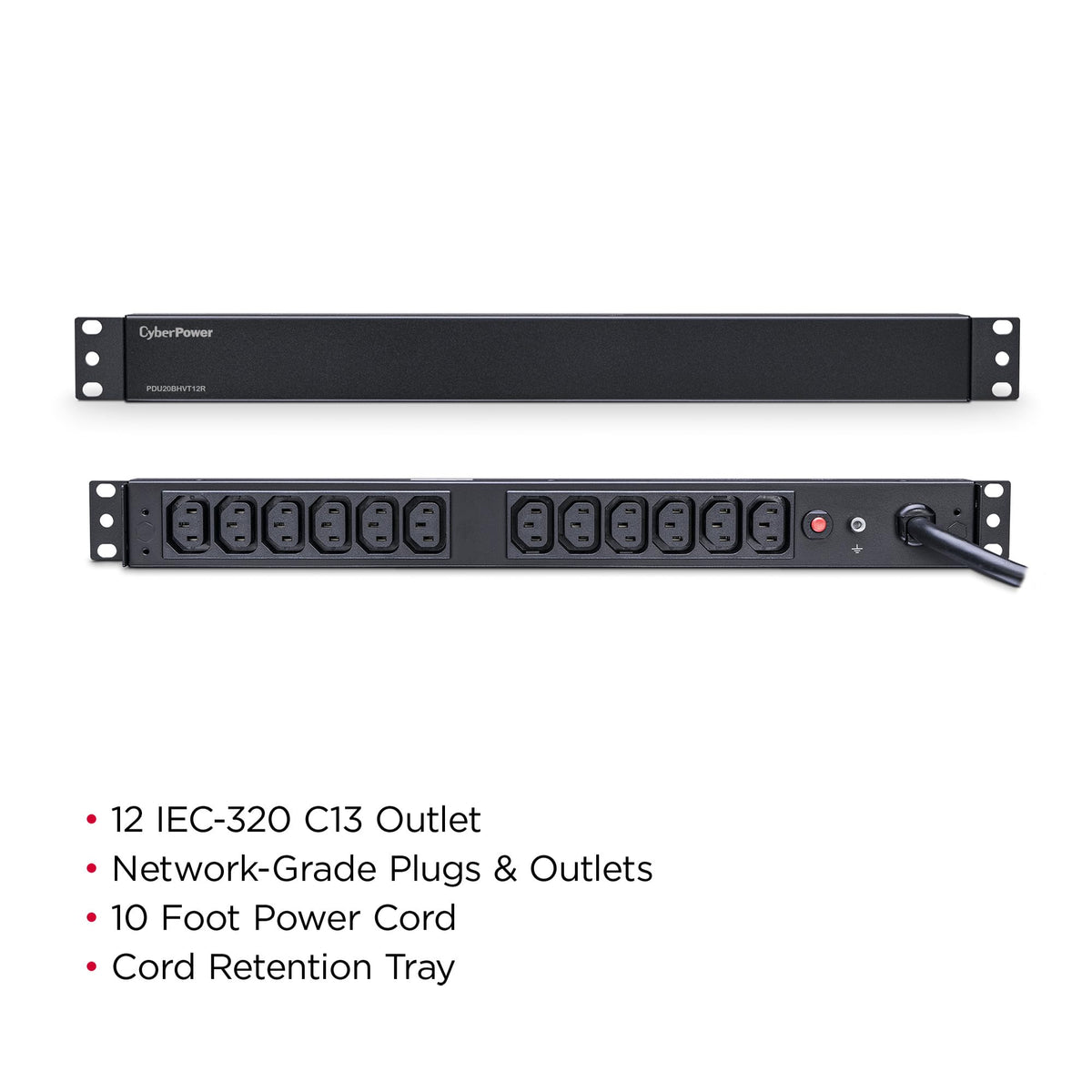 The Cyberpower 12-Outlet (12 Rear) Rack Mount Basic Power Distribution Unit (Pdu20Bhvt12R) Provides 208V/230V 20A Output. It Distributes Power To 12 Iec-320 C13 Receptacles From A Single Nema L6-20P Twist Lock Plug, With Unfiltered Electrical Pass-Through. Designed For Datacenters And Other Electrically Demanding Applications, This Unit Has A Rugged, Industrial-Grade Metal Housing And A 10-Foot Ac Power Cord. It Can Be Mounted Either Horizontally Or Vertically, Includes A Cord Retention Tray And Is Etl/Rohs Certified. A Lifetime Warranty Ensures That This Pdu Is Free Of Defects In Design, Assembly, Material Or Workmanship.