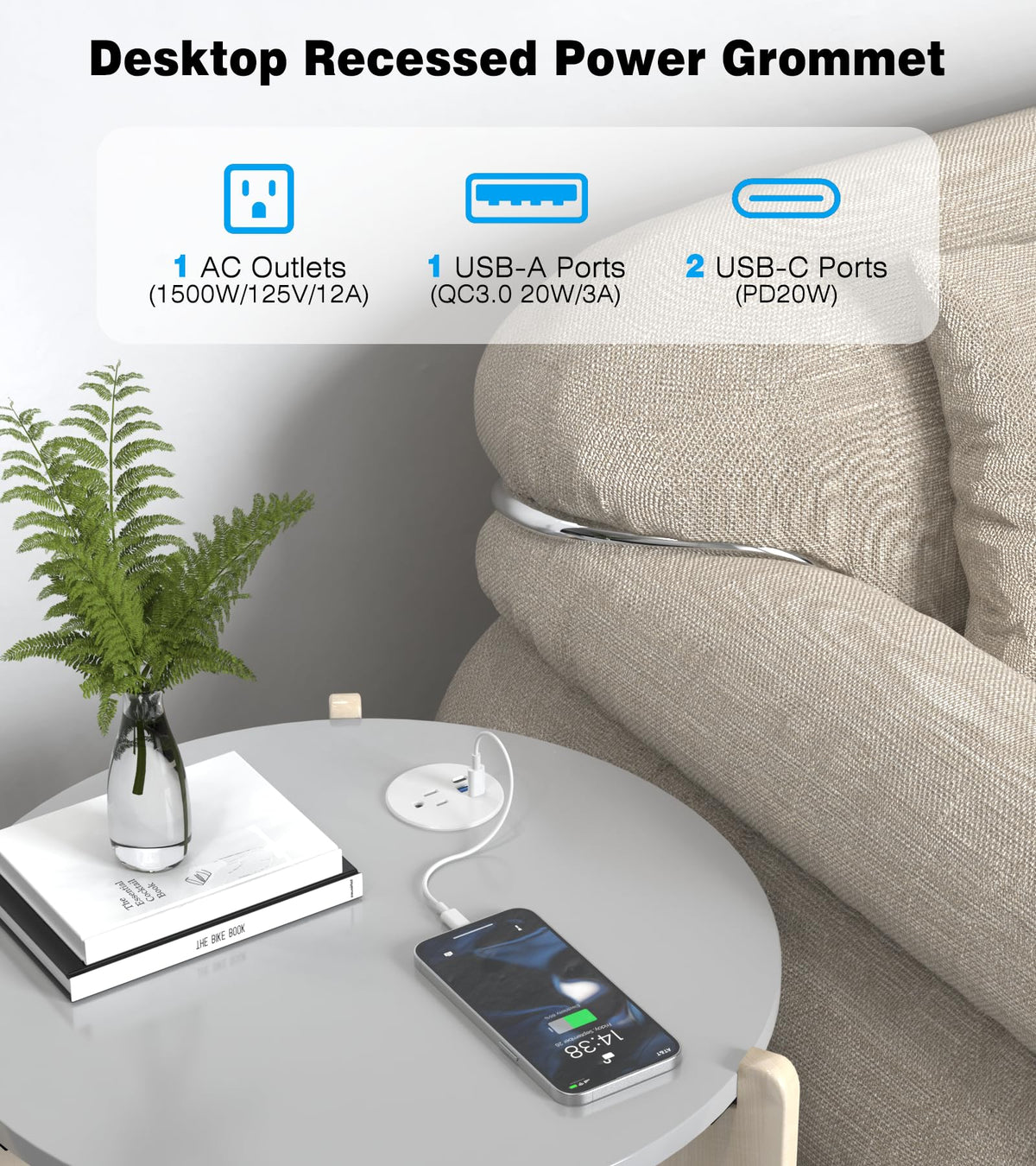 Desk Grommet Power Outlet, 2.5 Inch Desktop Recessed Outlet With 20W Fast Charging Usb-C Port, Flush Mount Outlet For Conference