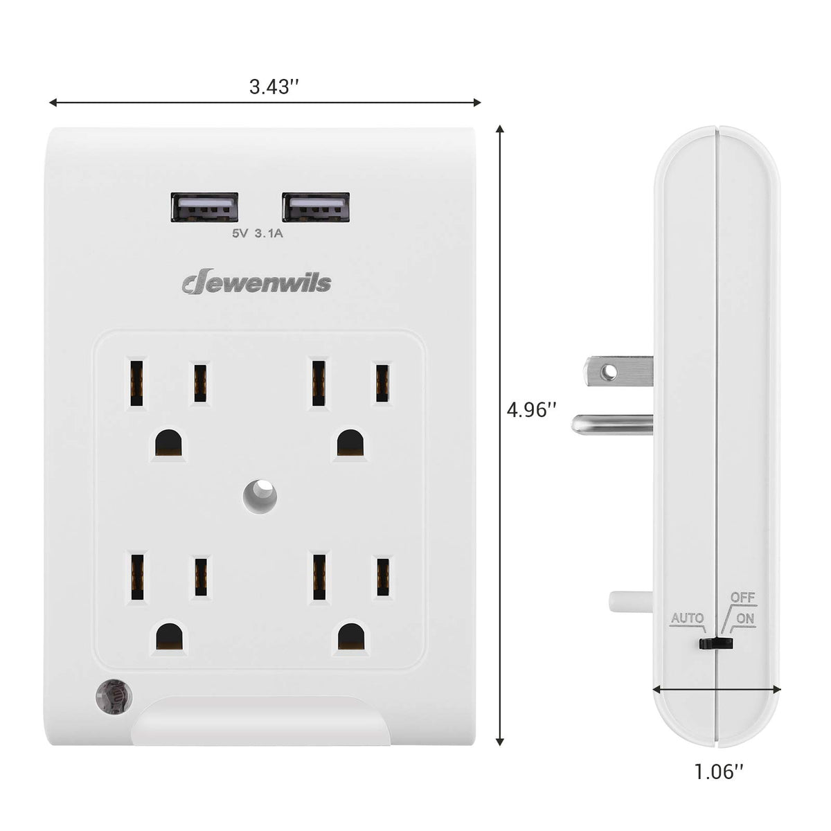 Dewenwils Multi Plug Outlet 2 Pack, 4 Outlet Extender With 2 Usb Ports, Light Sensor Night Light, 1080 Joules Surge Protector, E