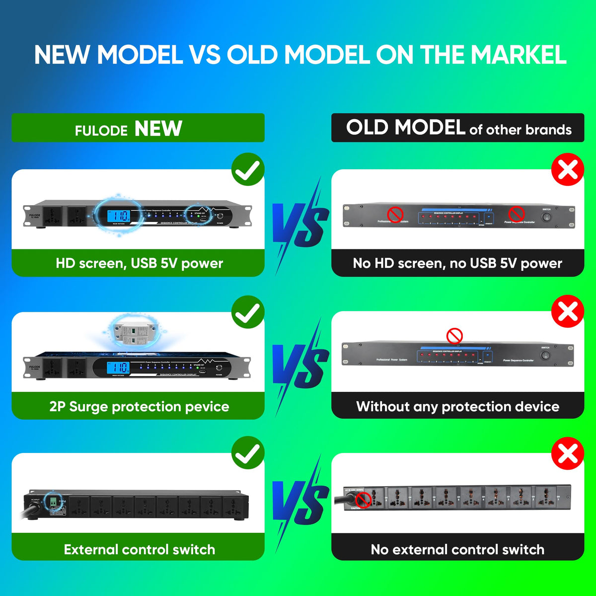 Fulode 2000W 10 Socket Sequential Rack Professional Audio Power Conditioning ,Digital Voltmeter, Usb, Surge Protector For Home T