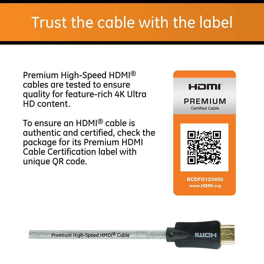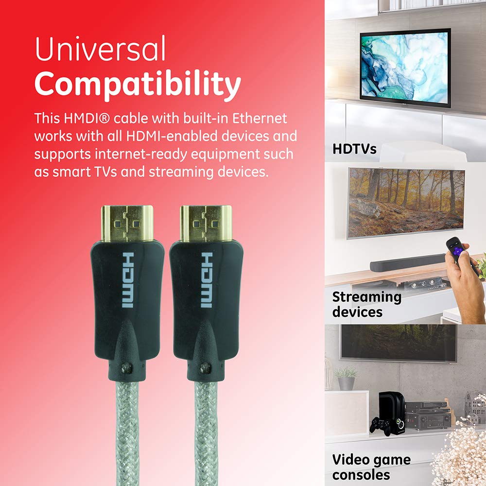 Hdmi 2.0 - Invest In Superior Signal Quality With A Ge-Branded Pro Premium Certified High-Speed Hdmi Cable. Its Increased Hdr Capability Supports Up To 60 Frames Per Second, Delivering A Bright, Clear Picture With Richer, More Vibrant Colors Designed To Enhance Streaming, Real-Time Gaming, 3D Movies, Virtual Reality And More. With Built-In Ethernet And The Ability To Transfer Data At 18 Gbps, This Hdmi Cable Is Ready For The Future. This High-Performance Cable Features Maximum Shielding To Minimize Electromagnetic Interference, As Well As Boost Data Transfer. The Durable Structure Is Resistant To Stiffening And Damage, With Extra Copper Plating Surrounding The Connectors For A Secure Connection. The Braided 6Ft. Cable Provides Versatile Setup Options For Your Space, While The Plug-And-Play Installation Is Effortless. Easily Connect Blu-Ray And Dvd Players, Streaming Devices, Gaming Consoles And More To Your Tv Or Electronic Display. Built-In Ethernet Supports Internet-Ready Equipment Without Needing Additional Cables Or A Wi-Fi Connection. Upgrade Your Home Entertainment System With A Ge-Branded Pro Premium Certified High-Speed Hdmi Cable. Streaming Devices: Roku, Fire Tv, Apple Tv, More. Videogame Consoles: Playstation (Ps5, Ps4, Ps3), Xbox (Xbox Series X, Xbox Series S, Xbox One, Xbox 360), Nintendo Switch, More.