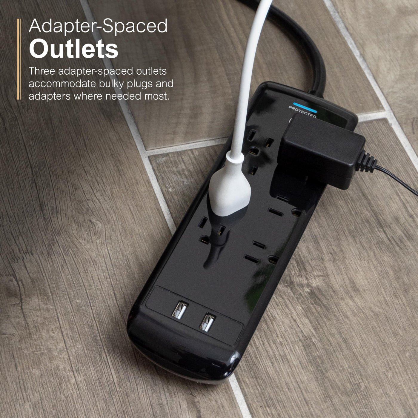 Ge Pro 7 Outlet Surge Protector, 2 Usb Ports, 3 Ft Extension Cord, 1780 Joules, 2.1 Amp/10 Watt, 3 Adapter Spaced Outlets, Flat