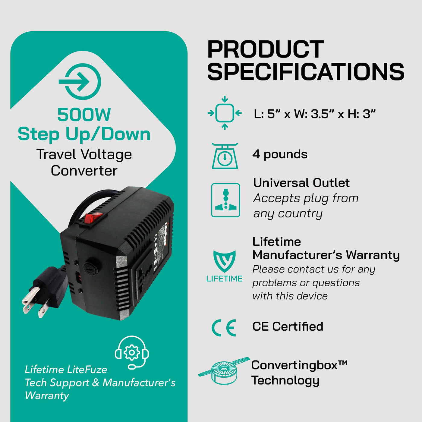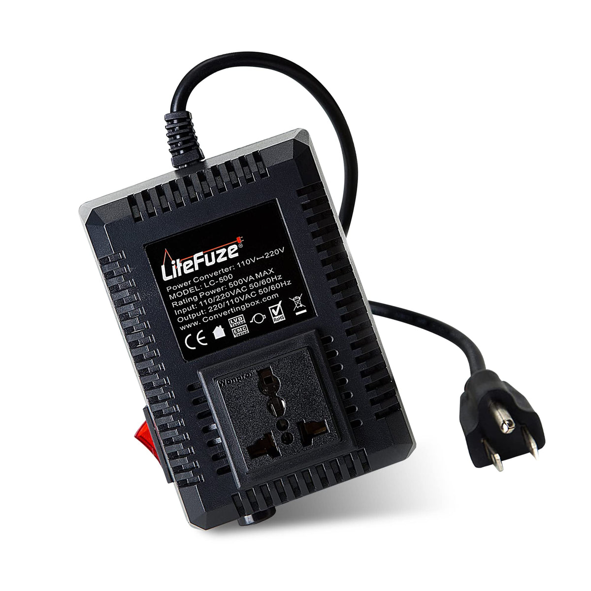 The Litefuze Lc Series 500-Watt Travel Voltage Converter Is A Compact And Lightweight Power Transformer Made For Travellers. With A Weight Of 2 Lbs. And Compact Dimensions Of 5 X 3.5 X 3 Inches This Voltage Converter Is Easy To Carry In Your Luggage. This Voltage Converter Has A Maximum Capacity Of 500 Watts Making It Suitable For Use With A Wide Range Of Products Like Hair Straighteners, Laptops, And Chargers. Our Power Converter Comes With Step-Up And Down Functionality Meaning It Can Convert 110/120V To 220/240V And Vice Versa, Our 110V To 220V Converter Also Features A Universal Output Socket That Can Accept Plugs From Most Countries Except South Africa. The 220V To 110V Voltage Converter Comes With Thermal Fuse Protection Protecting The Converter From Overload And Burnout. The Litefuze Lc 500 Comes With A Grounded Cord And A High-Resistance Copper Coil Ensuring Durability. The Power Converter Comes With The Converting Box Technology Making It Energy Efficient, Lightweight, And Noiseless During Operation. The Converter Comes With A 5-Year Warranty And Is Also Ce-Certified Ensuring Safety And Quality.