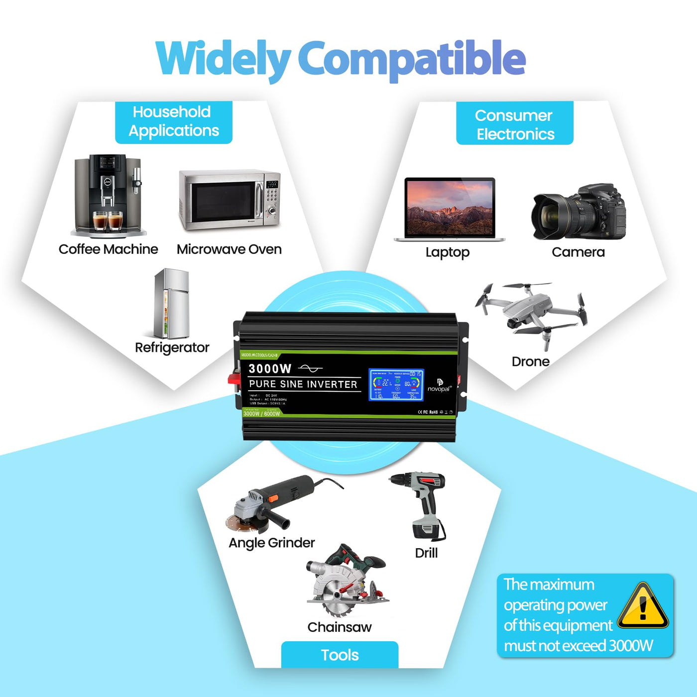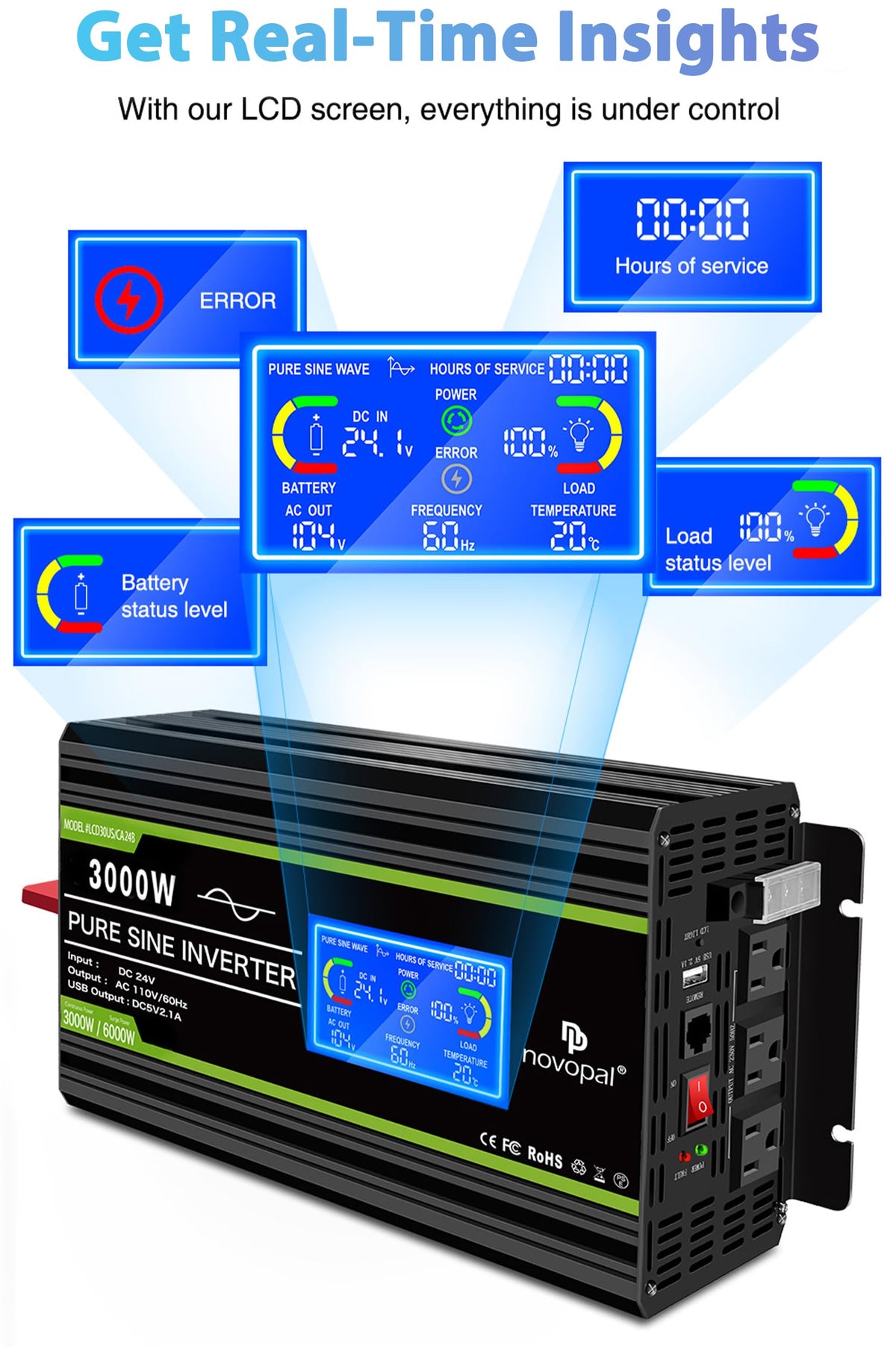 Novopal 3000 Watt Pure Sine Wave Power Inverter 24V To 110V 120V Rv Inverters With 3 Ac Outlets,High Power Ac Terminal-16 Ft Rem