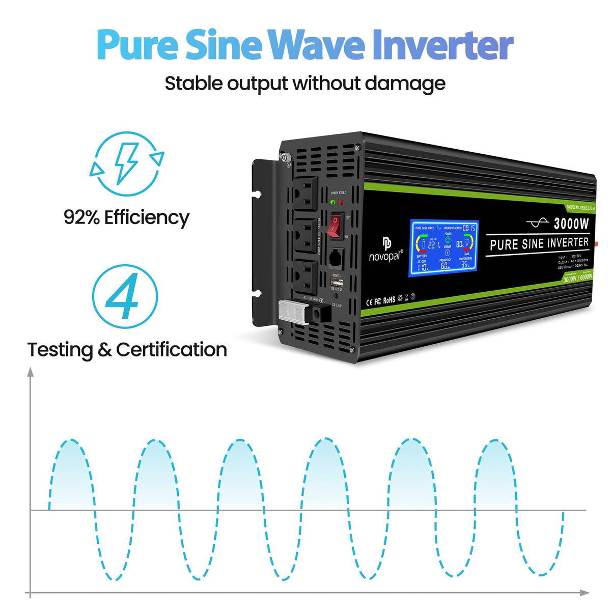 Get Power On The Go!Warranty Policy:We Provide One Year Limited Warranty , Damage Due To Reverse Polarity Is Not Covered By Warranty .For More Details, Please Visit Our Website Or Find It In Our User Manual.Technical Parameter:Output Power (Continuous): 3000Wmaximum Active Surge Rating (Less Than 1 Second) :6000Wmaximum Ac Current Per Socket :25 Ampereac Output Voltage (Idle) :110/120 Vac +/-3Voutput Frequency: 60Hz +/-1Hzoutput Waveform: True/Pure Sine Wave (≪3% Thd)Efficiency: 90=% (24V Dc)No Load Current Draw (Dc Side): 0.6-2A