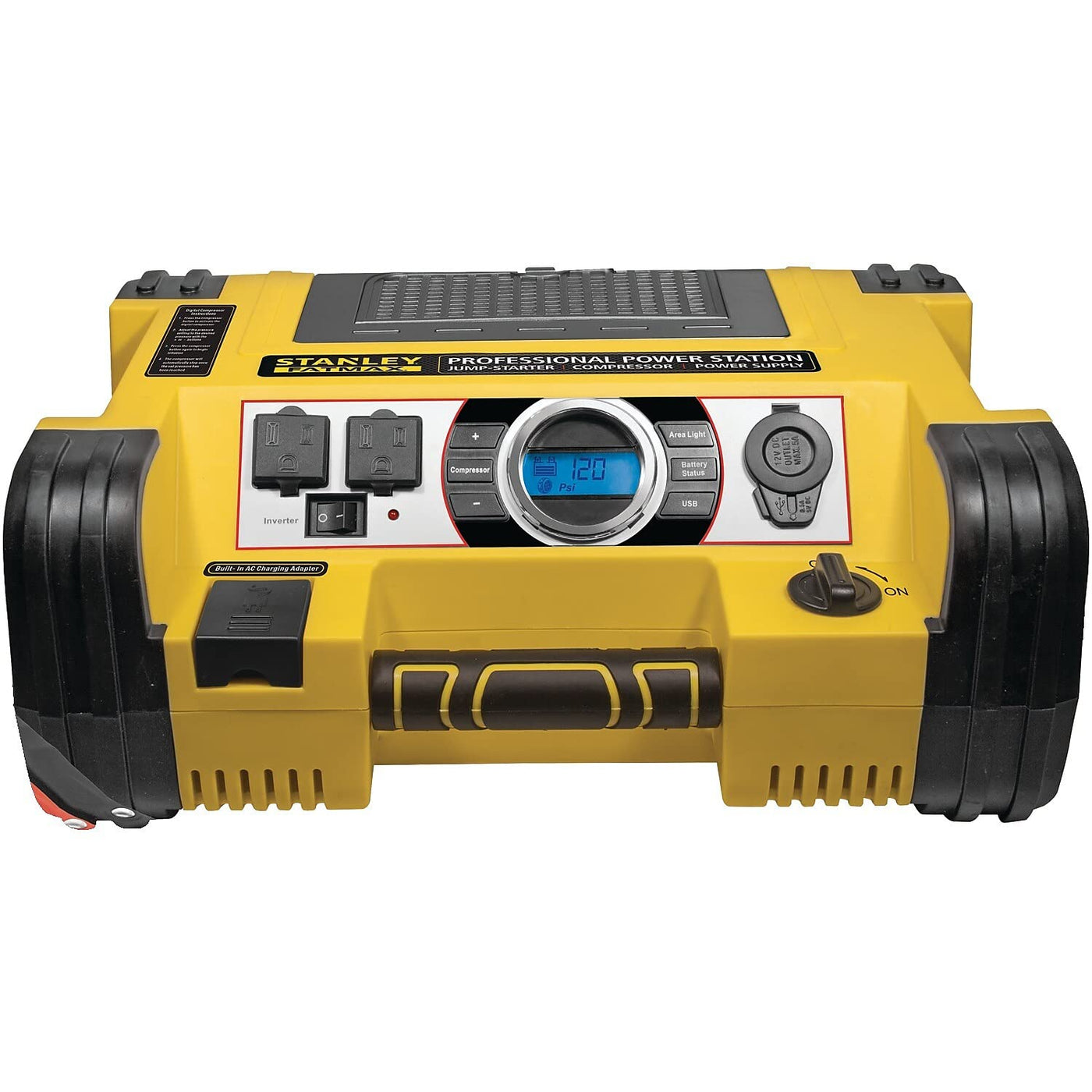 The Stanley Fatmax Professional Digital Power Station Features 700 Instant-Starting Amps And 1,400 Peak Battery Amps. The Power Station Also Boasts 500 Watts Of Portable Household Power With Two Ac Power Outlets. A 12-Volt And Usb Outlet Are Also Featured So You Can Charge Personal Electronics. The 120 Psi Digital Compressor With A Backlight Gauge Has A Heavy-Duty Brass-Tipped Surefit Compressor Nozzle. The Nozzle Connects Securely To Tire Valve Stems. Not Only Is The Digital Compressor A Convenient For Flat Tires But It Is Also Great For Camping, Tailgating And Many More Needs! The Professional Power Station Has A Reverse Polarity Alarm To Alert You When There Is An Improper Connection. There Is A Power And Charge Indicator That Alerts You To The Current Status Of Your Items. The Power Station Includes A Set Of All Metal Powder Coated Clamps And A Built-In 120-Volt Ac Charger That Recharges A Unit With Standard Household Extension Cord.