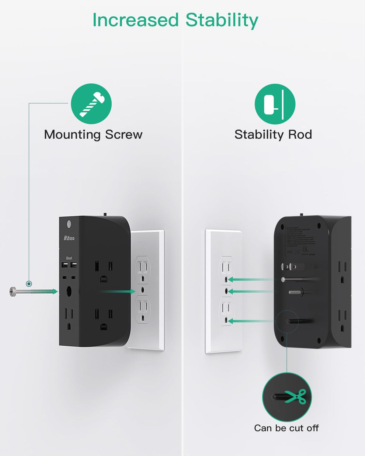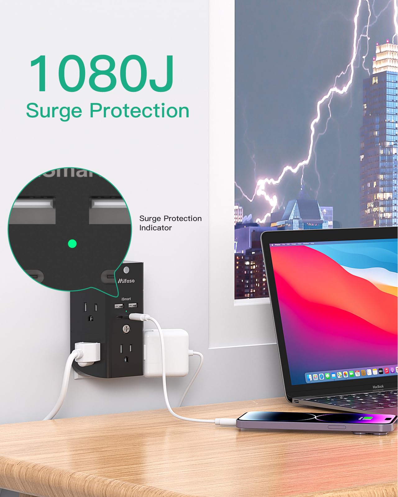Surge Protector Outlet Extender With Night Light, 5 Outlet Splitter And 4 Usb Ports (2 Usb C Charger), Multi Plug Wall Outlet Fo
