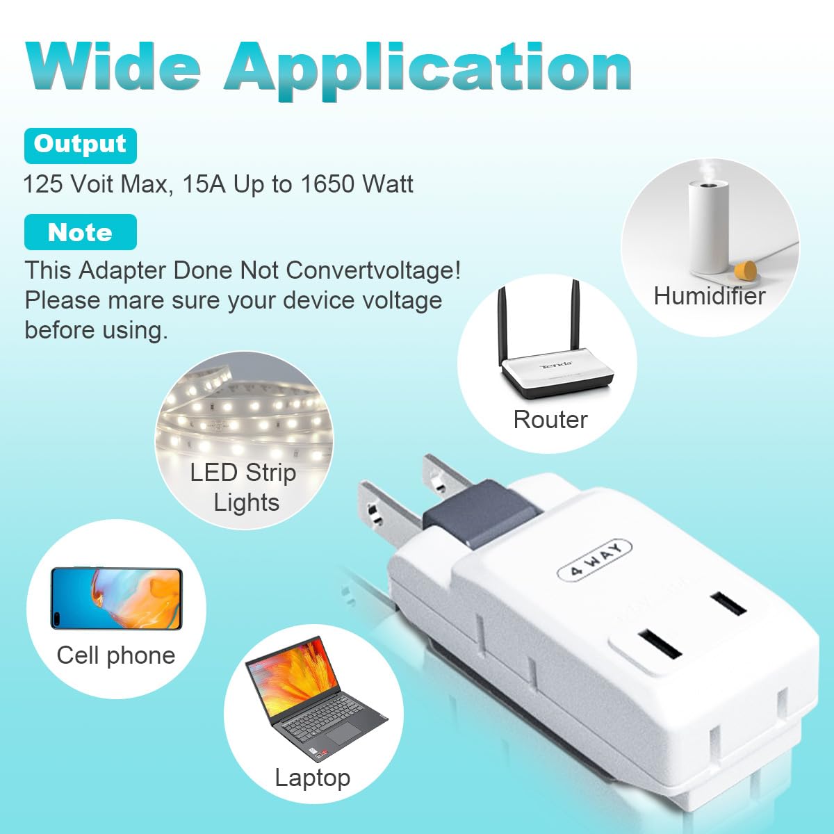 Expands Wall Outlets Sycons 4 Outlet Power Adapter Triples The Number Of Available Outlets Compared To A Standard Wall Outlet. Swiveling Outlets Vertically Swivel This Outlet Adapter Up Or Down To Plug Cords In Facing Up, Down, Or To The Front Depending On Preference. You Can Also Swivel The Outlet Keeps Plugs Close To The Wall In Tight Places Which Saves Much Space. Compact Size, A Direct Plug-In Design That Utilizes A Slim Form Factor To Accommodate 3 Outlets Which Allow You To Easily Slip This Adapter Into Your Laptop Bag Or Carry-On. Great For Living Rooms, Bedrooms, Kitchens, And Offices. Attention: 15A/ 125Vac/ 60Hz/ 1650Watts/ Etl Listed, Indoor Use Only.