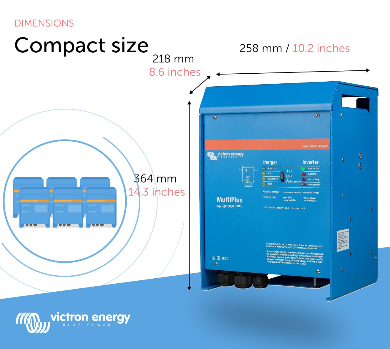 Victron Energy Pure Sine Wave Inverter: The Victron Energy Multiplus Inverter Charger Is A Powerful True Sine Wave Inverter And A Sophisticated Battery Charger With Adaptive Charge Technology | Power Assist: With The Unique Power Assist Feature The Multiplus Solar Inverter Will Prevent Overload Of A Limited Ac Source, Such As A Generator Or Shore Power Connection | Power Without Interruption: In The Event Of A Grid Failure, Or When Shore Or Generator Power Is Disconnected, The Victron Inverter Is Activated Fast, Within 20Ms, And Takes Over The Supply To The Connected Loads | Parallel Operation: Up To 6 Victron Energy Multiplus Purew Sine Wave Inverter Units Can Operate In Parallel To Achieve Higher Power Output, In Addition To Parallel Connection, Three Units Can Be Configured For Three-Phase Output. | Installation: Incorrect Installation Can Be Hazardous, Please Consult A Licensed Professional And Follow All Applicable Electrical Codes During Installation