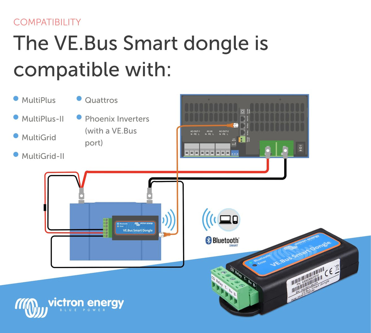 Victron Energy Ve.Bus Smart Dongle Is Two Products In One: Bluetooth Accessory And Voltage, Temperature-Sense Device | The Bluetooth Accessory For Victron Energy Range Of Inverter/Chargers: Multis, Multiplusses, Multiplus-Ii, Multigrid, Multigrid-Ii, Victron Energy Quattros, And Phoenix Inverters With A Ve.Bus Port | When Installed, Use The Victronconnect App To Monitor Operation And Also Operate The System: Change The Input Current Limit As Well As Switch Between Off, On And Charger-Only Mod | Can Work As A Voltage- And Temperature-Sense Device For The Victron Energy Inverter/Charger | For Monitoring, The Device Is A Great Alternative In Caravans, Smaller Yachts And Motor Homes For Which The Victron Energy Color Control Gx Or Venus Gx Are A Step Too Far
