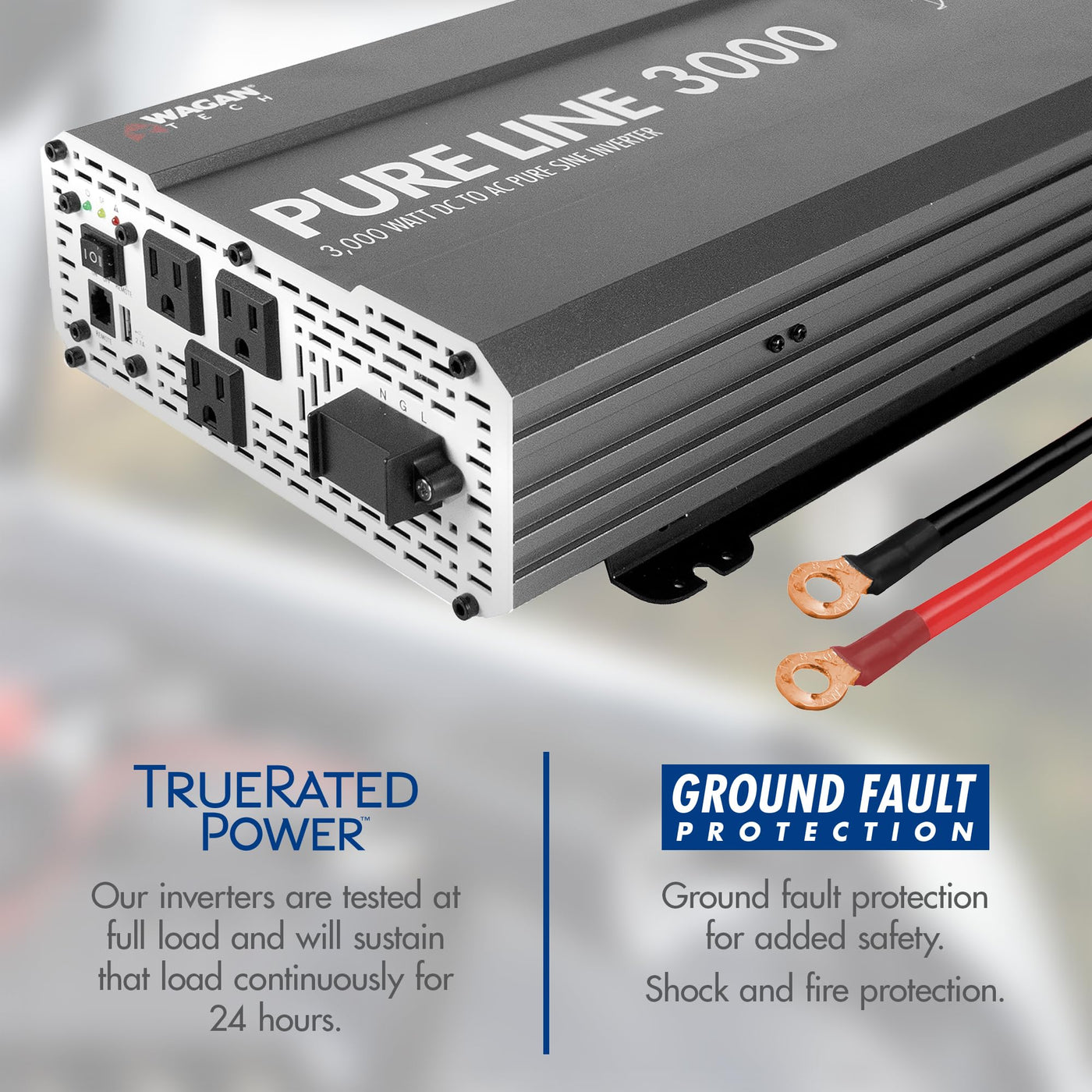 True Rated Power Inverter: 3000W With Surge Power 6000W - You Can Run Your Appliance Without Worry. Truerated Inverters Are Tested At Full Load And Will Sustain That Load Continuously. | Pure Sine Wave Power Inverter: The Compact And Efficient Inverter Not Only Looks Good But Performs Great; The New Pure Line Inverter Will Change The Way That You Look At Psw Power Inverters! | Fast Charging: Automatically Detect Your Devices To Deliver Optimal Charging Speed. It Has Three 3-Prong Ground Fault Protected 110V Ac Outlets, And 5V 2.1A Usb Port. | Multi Protection: Built-In Fuse To Protect Your Device, Safe Charging Design Provides Protection Against, Overheating, Under And Over Voltage Charging, Short-Circuiting, Overloads, And Overcharging. | Reliable Quality: Rohs Compliant, Ce Approved, And Etl Certified To Ensure Safety And Quality. Durable Metal Housing Protects The 12V To 110V Converter From Bumps And Impact.