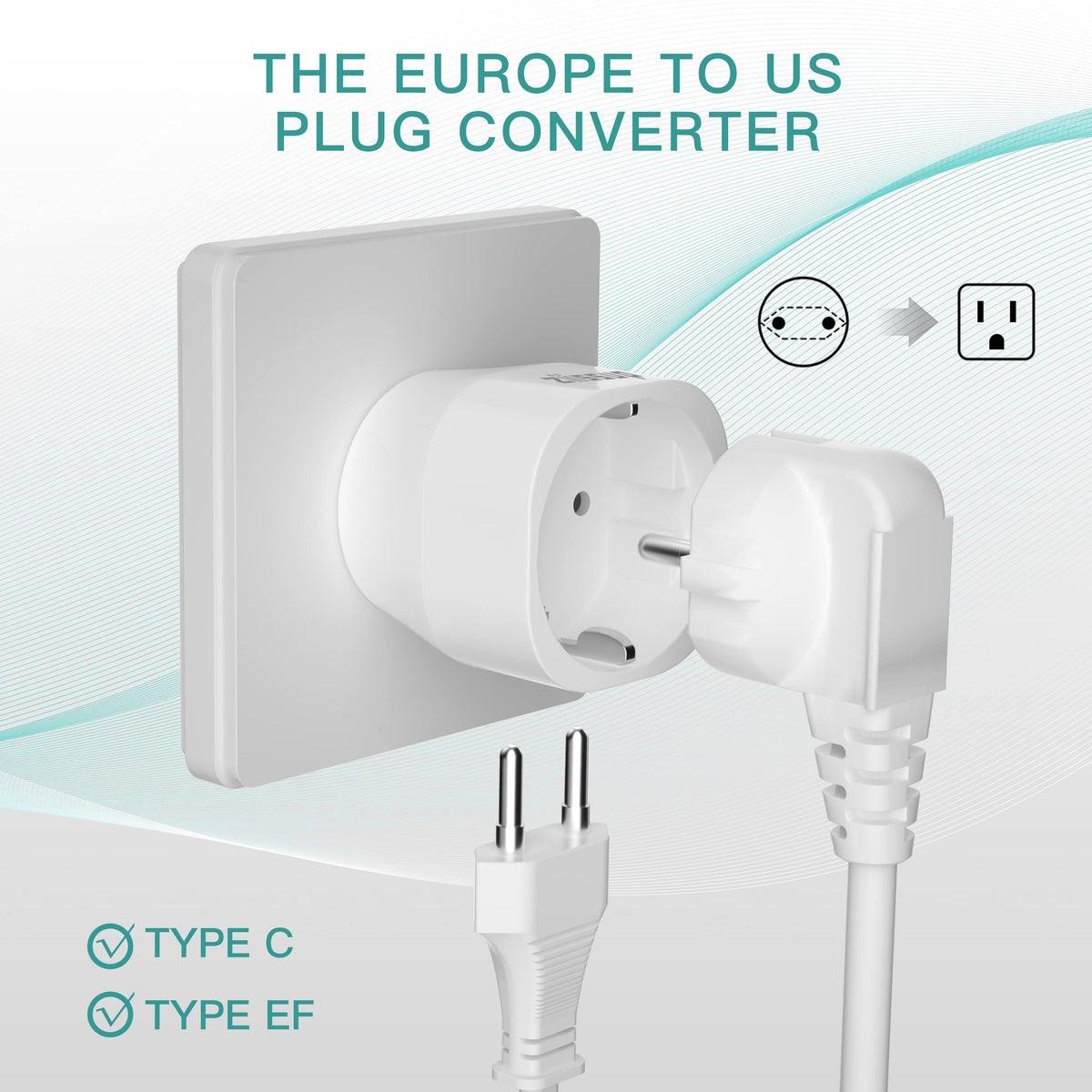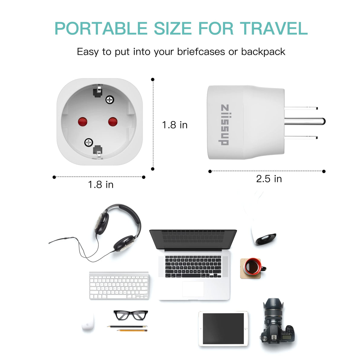 ?Europe To Us Plug Adapter?---Ziissup Eu To Usa Plug Adapter, Connect Type C/E/F Plugs From Europe (Including Belgium, Czechia, Finland, France, Germany, Greece, Netherlands, Norway, Poland, Portugal, Spain, Sweden And So On) To North American Wall Outlet. | ?Compact Design?--- This European To Us Plug Adapter Is Mini Size: 2.2*2.3*2.2 In. It Will Be A Great Travel Companion During Your Trips And Easy To Use. Without Taking Additional Adapters Or Sockets With You, Just Plug The Adapter Between The Wall Outlet And Your Devices. | ?Quality Assurance?--- This Travel Adapter Is Fcc Certified In The Us And With The Design Of Safety Shutters, Can Protect Your Electric Devices From Over-Heated And Over-Current, Over-Charge.Internal Protection Mechanisms And 750