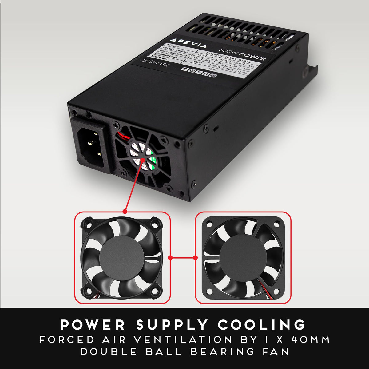 Q: How does the cooling system work in the Apevia ITX-PFC500W?A: The Apevia ITX-PFC500W features forced air ventilation through a 40mm double ball bearing fan, ensuring efficient cooling during operation.